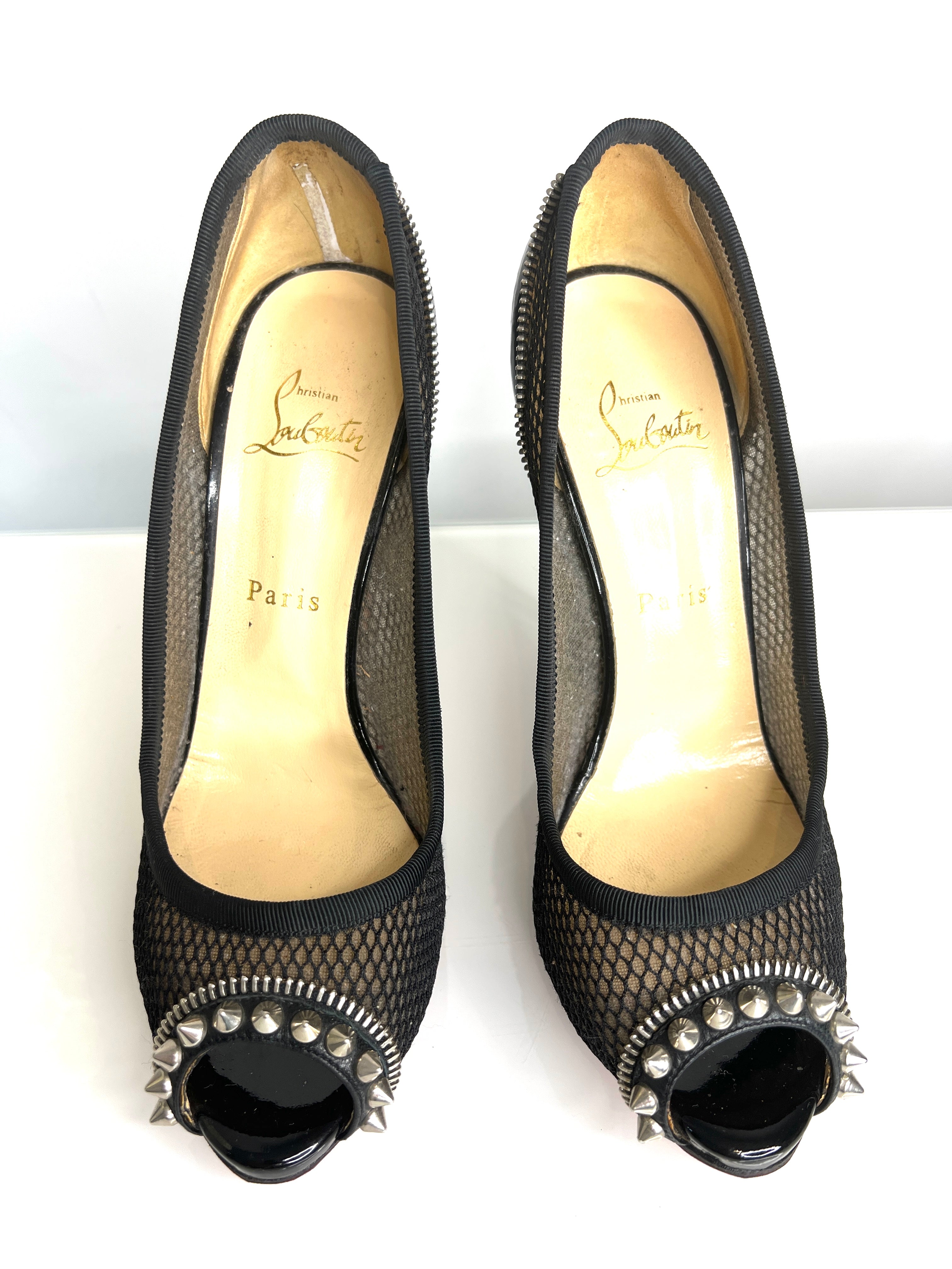 Christian Louboutin Preloved Shawnita Spiked Mesh Peep-Toe Black Heels 40 UK7