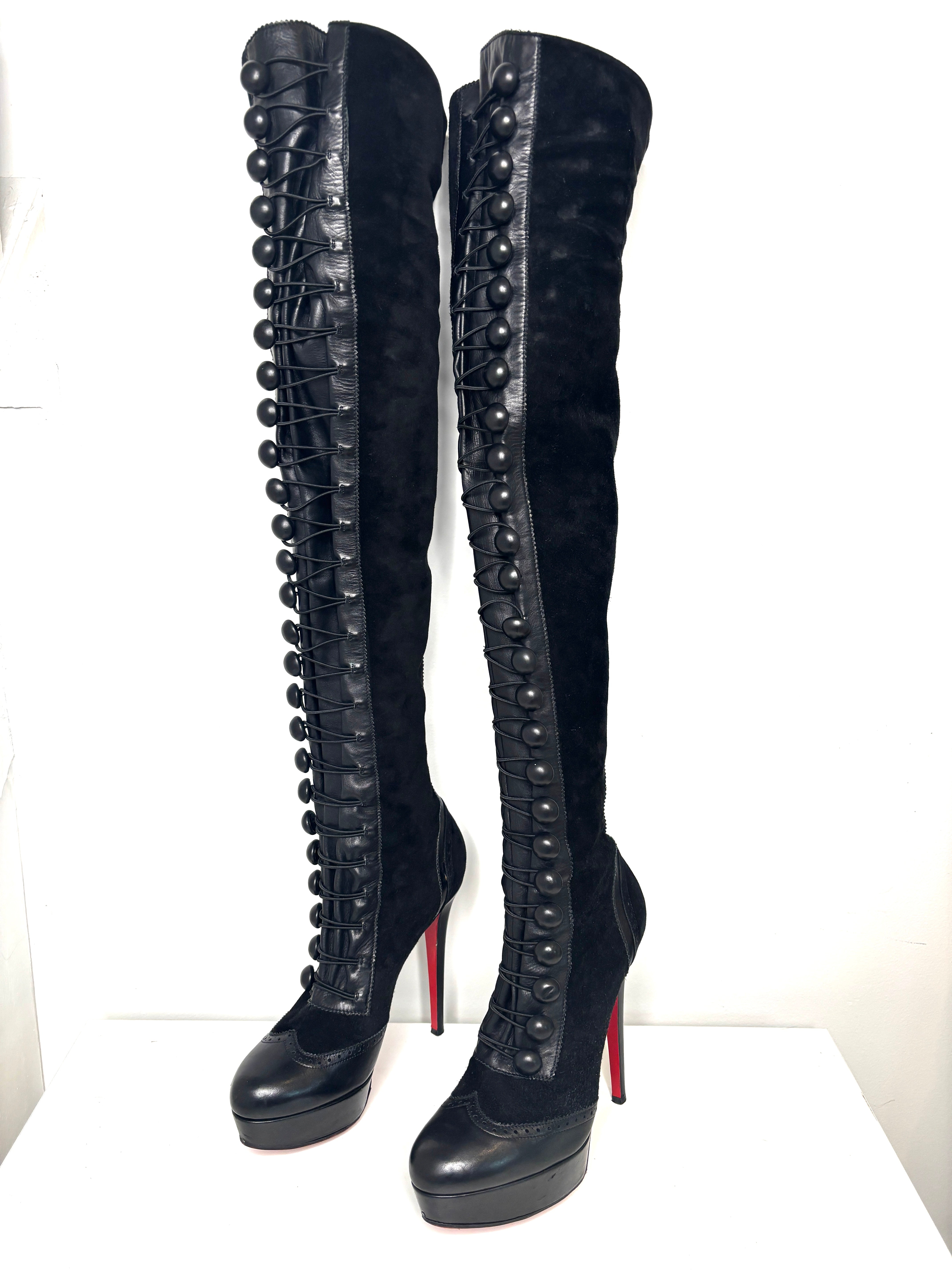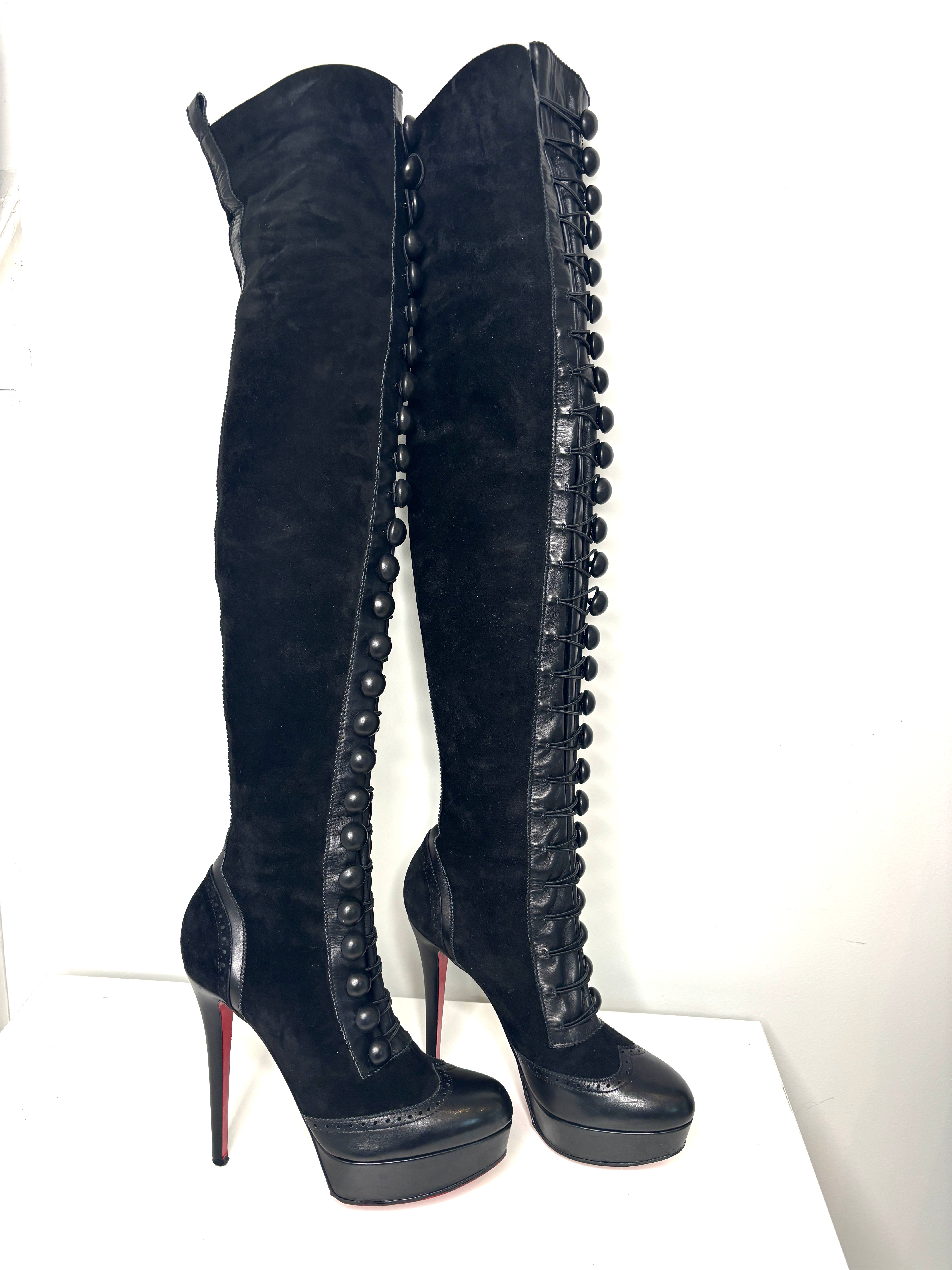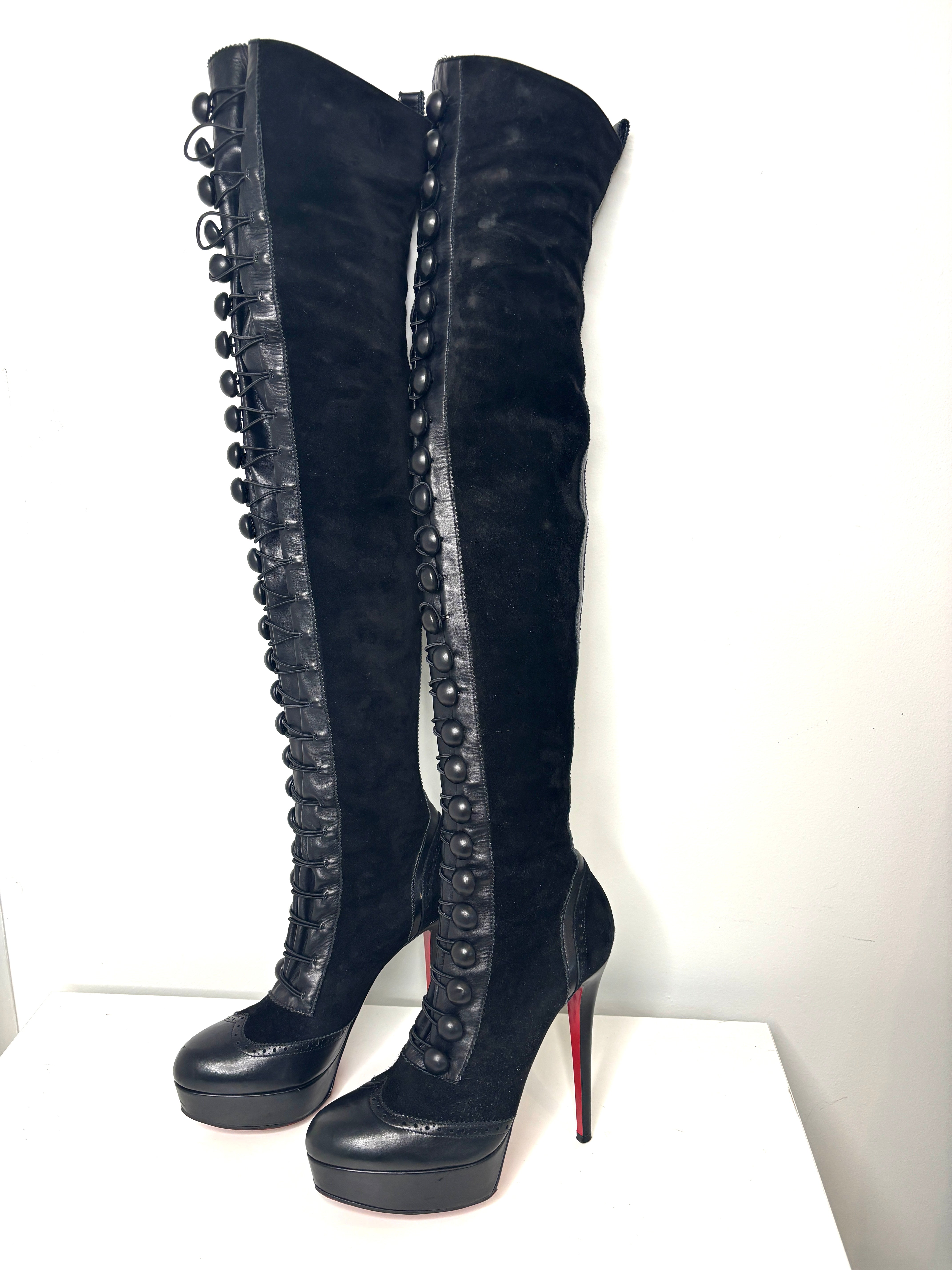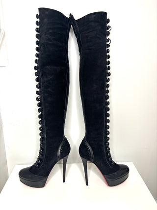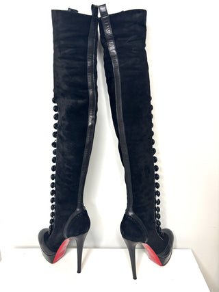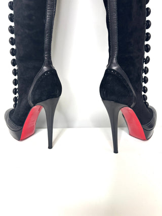 Christian Louboutin Majolique Over-the-Knee Platform Button Black Suede High Boots 39.5 UK6.5