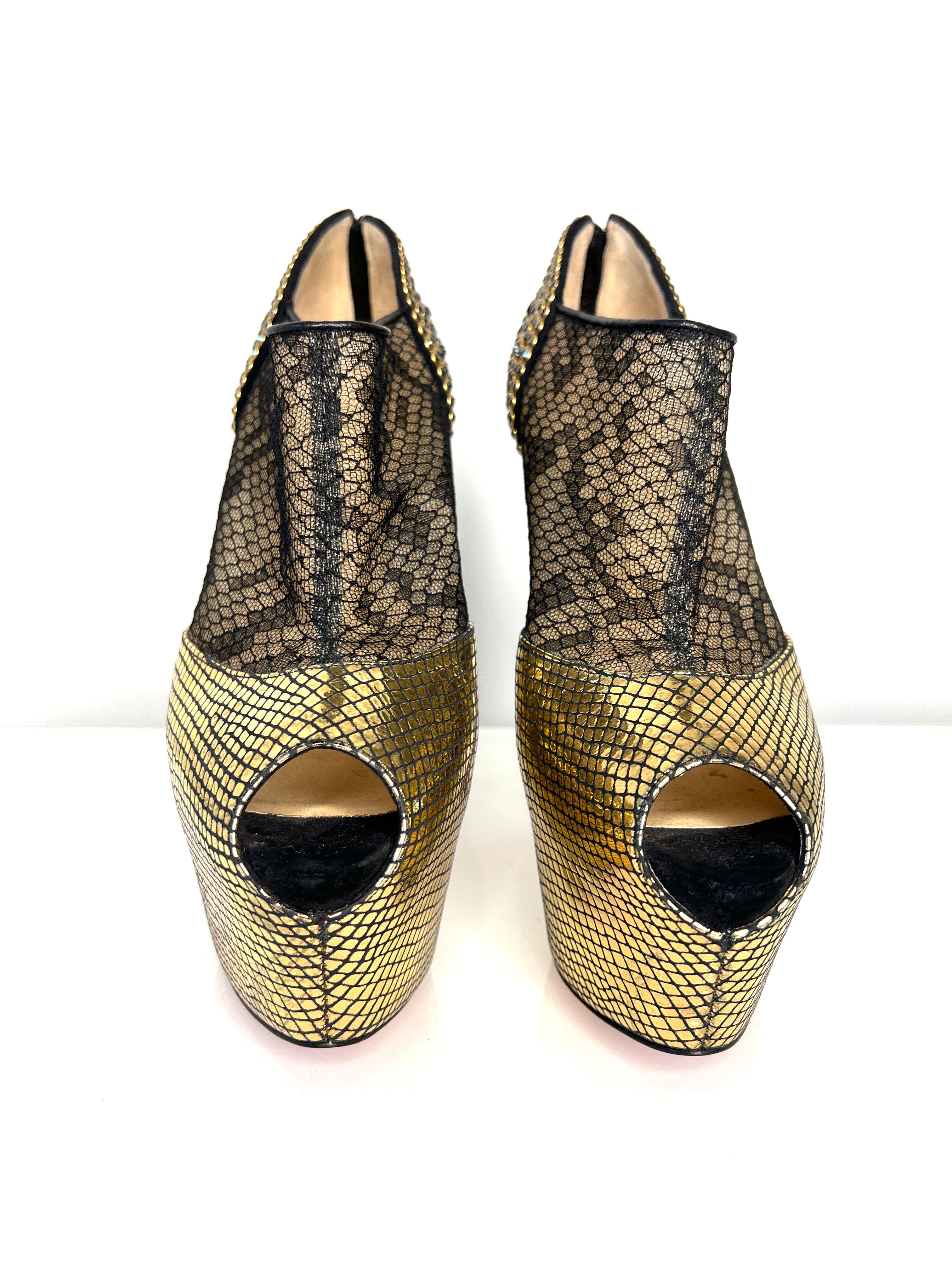These Christian Louboutin Aeronotoc booties feature gold snakeskin-printed leather, black lace and sexy peep toe