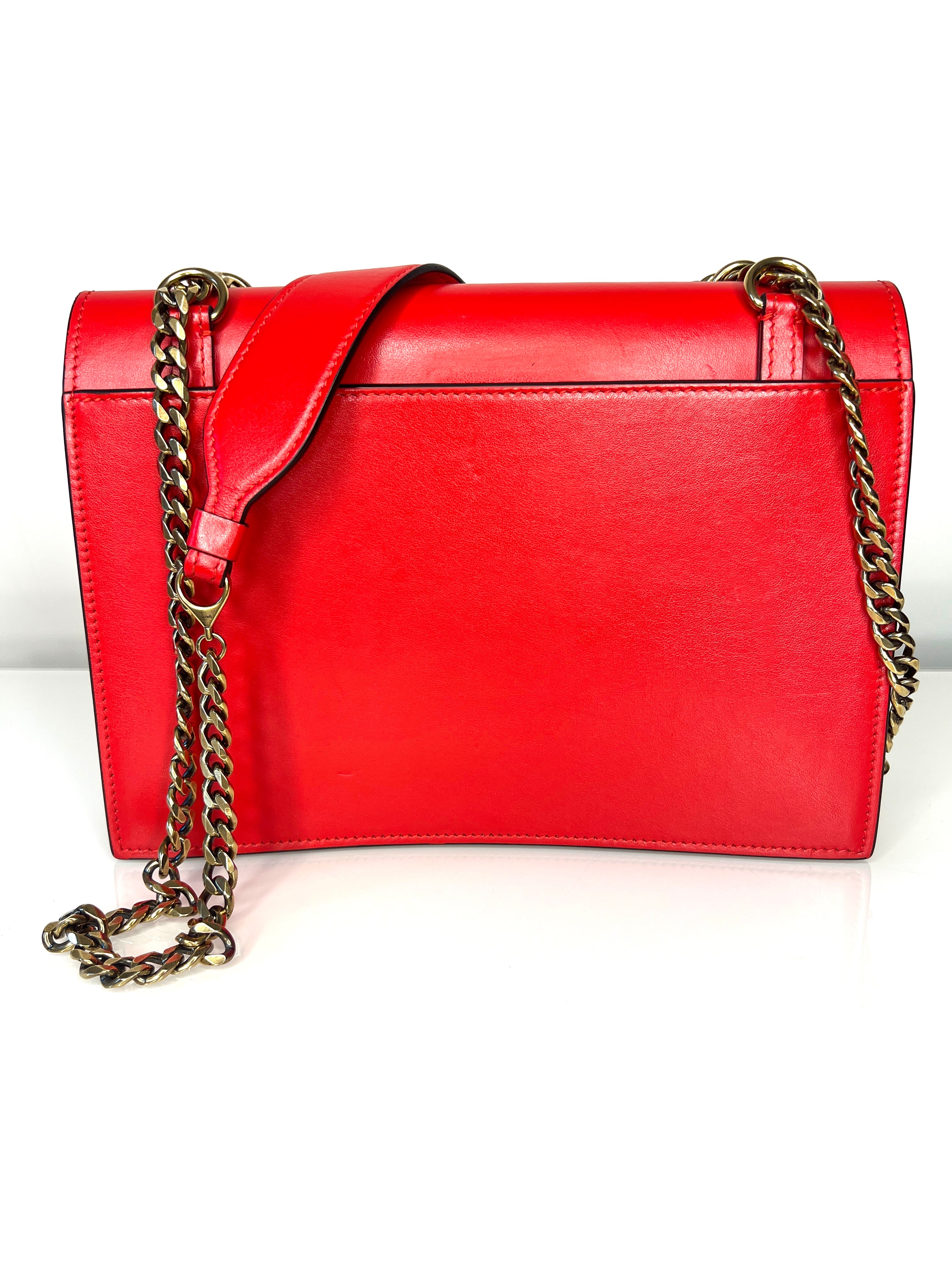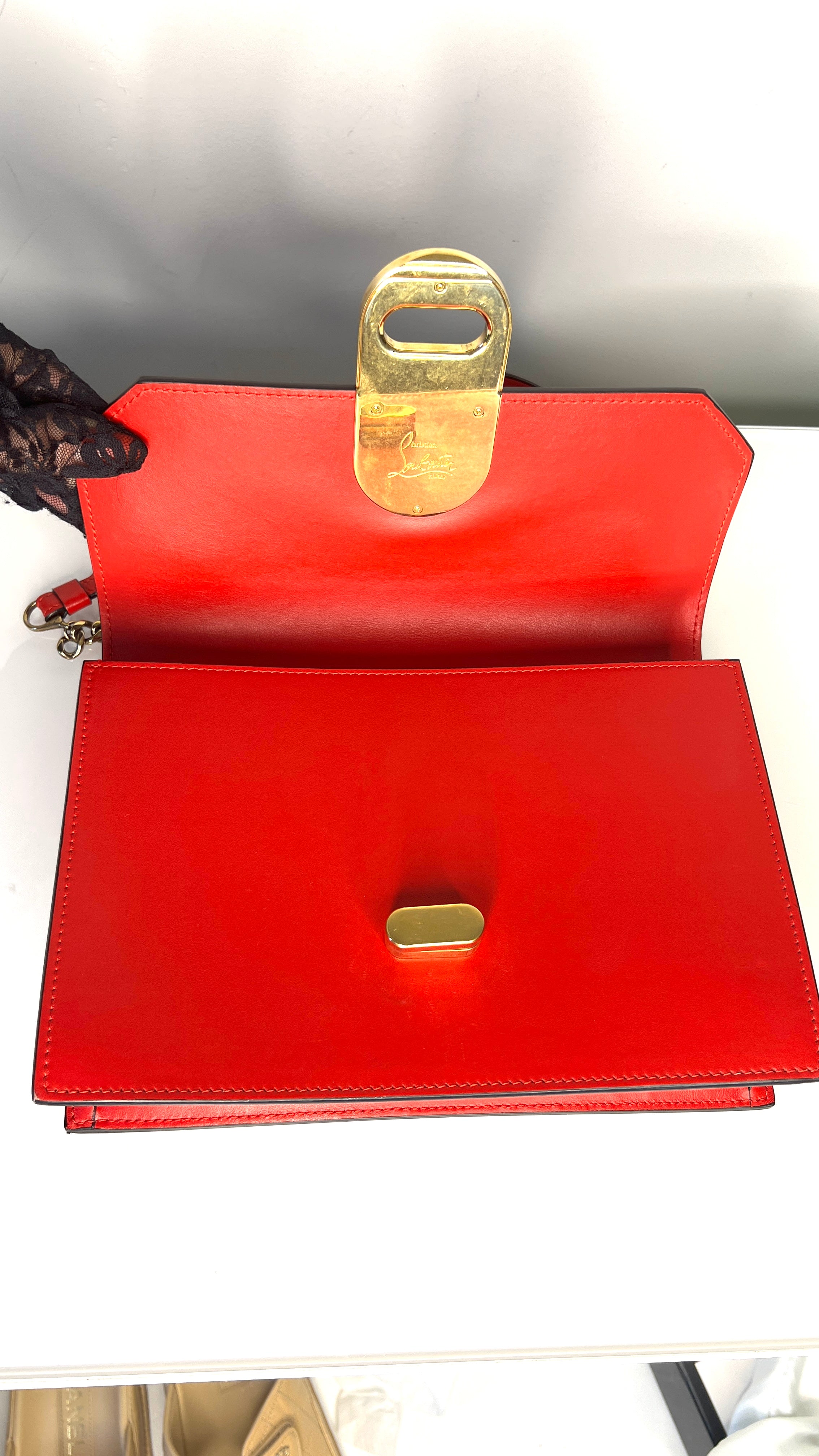 It has a distinctive gold-tone hardware, which includes a twisting clasp featuring the Christian Louboutin Log