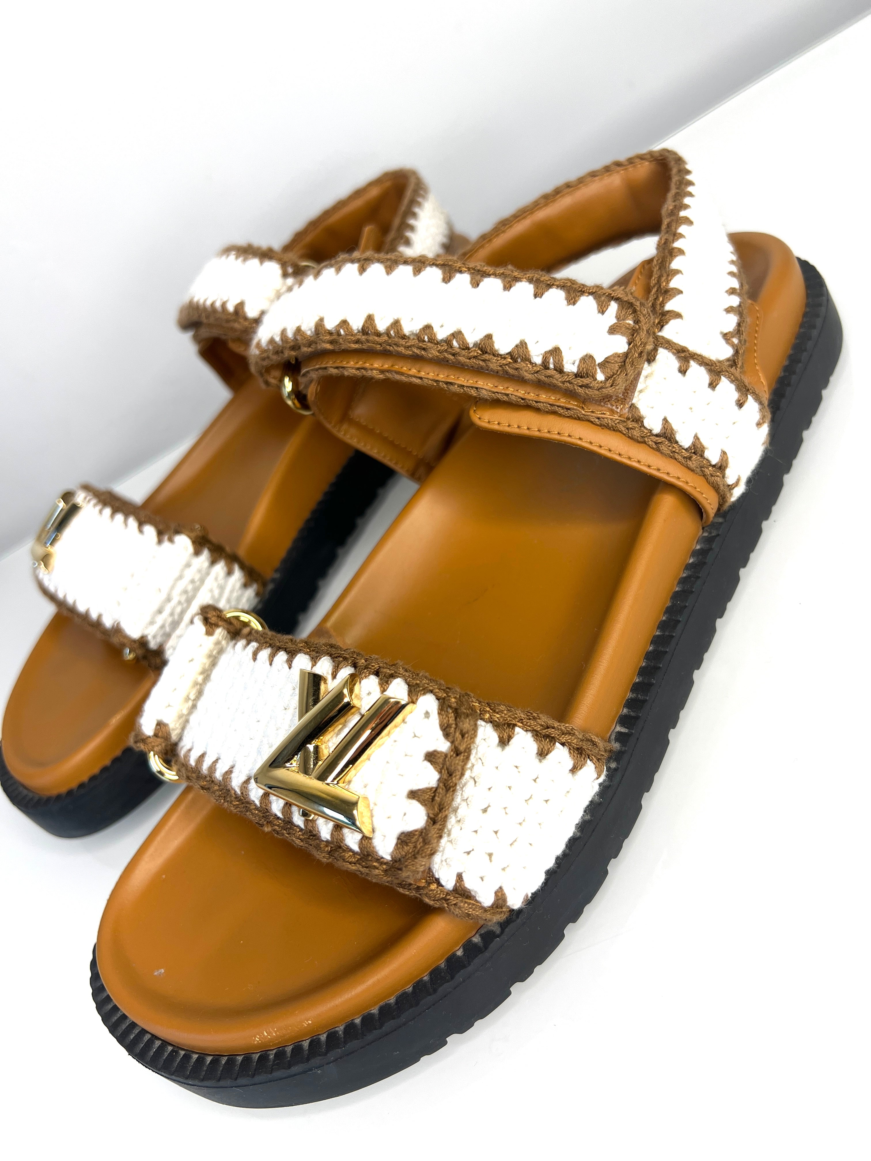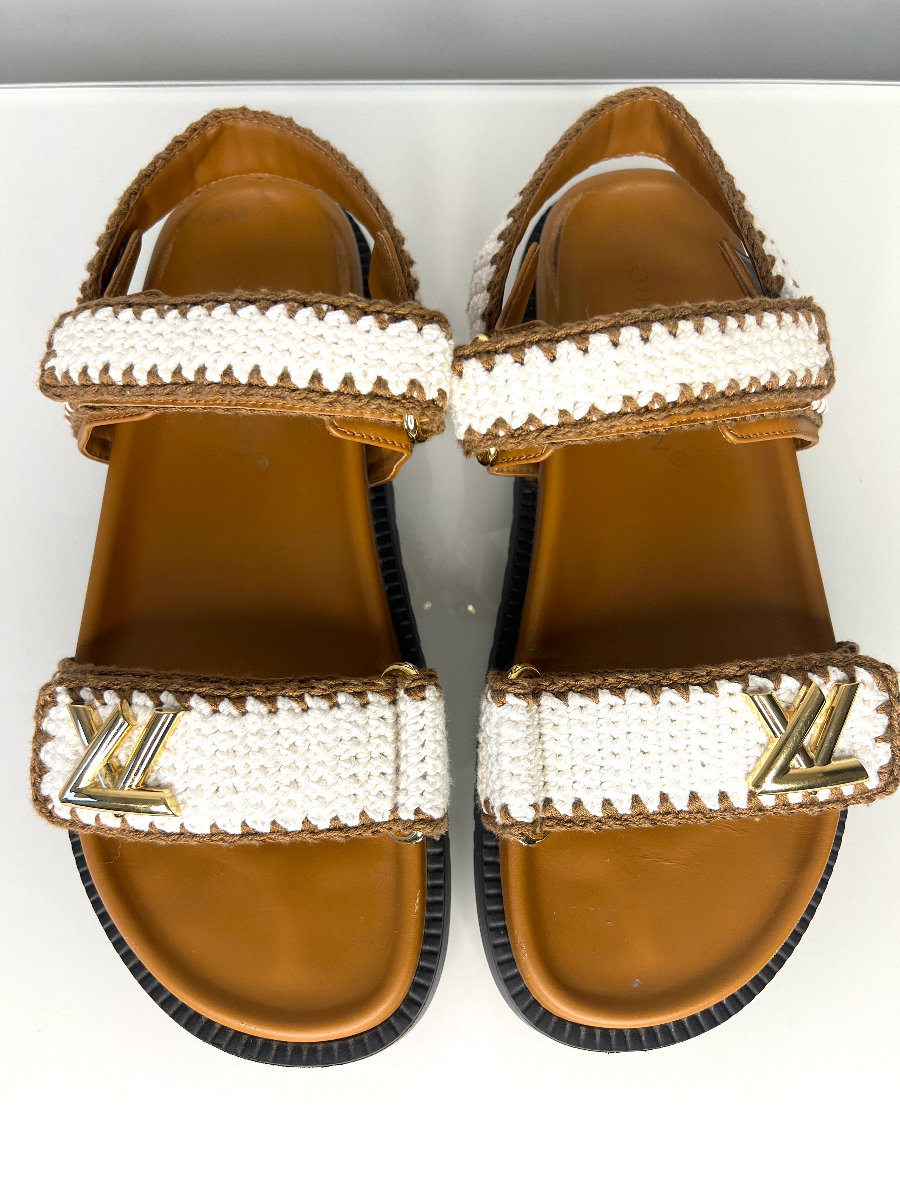 The LV Sunset Comfort Sandals are made in two-tone cotton crochet