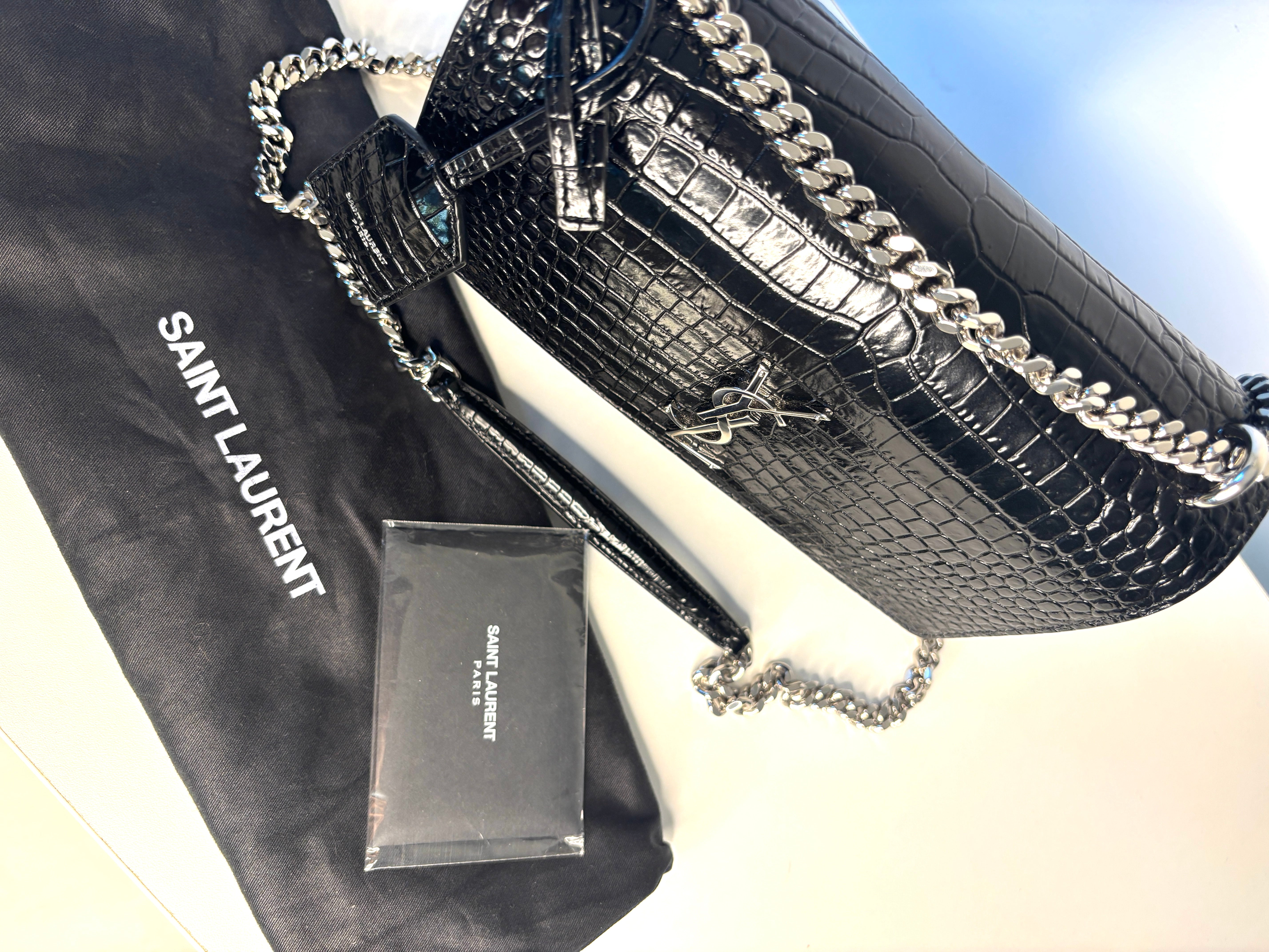 YSL silver-tone metal logo on front flap