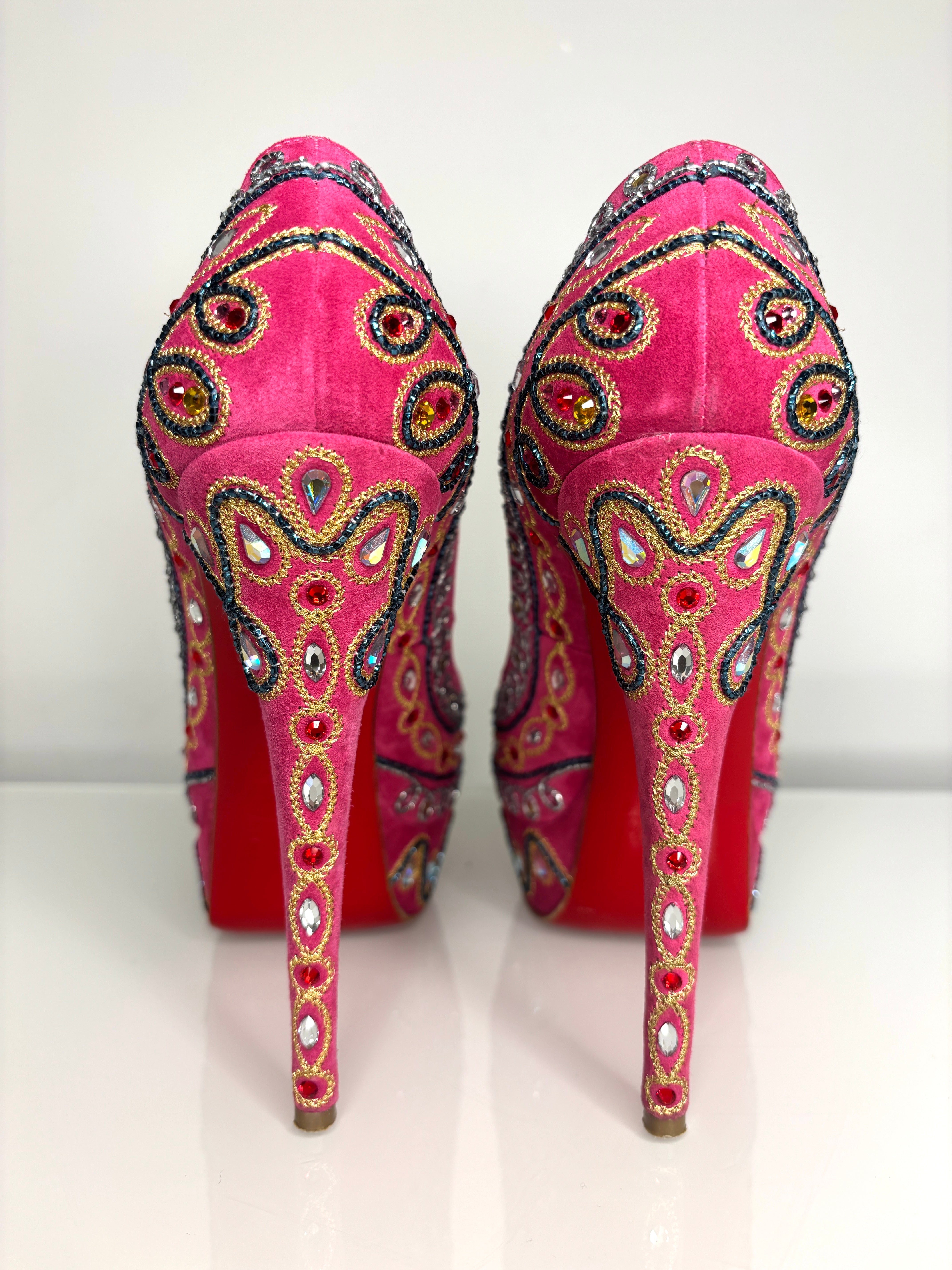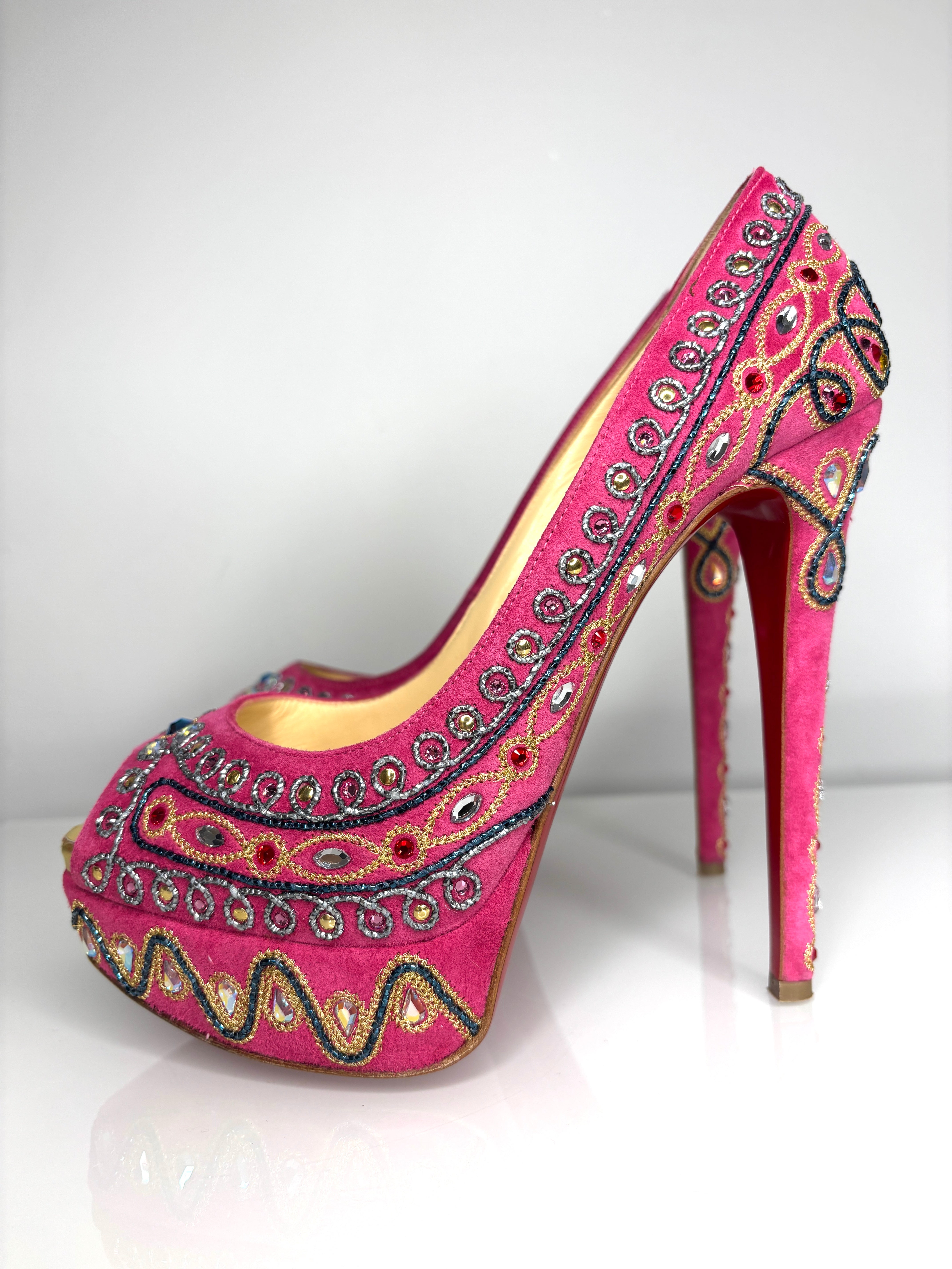 Inspired by Boolywood glam, these Christian Louboutin Bollywoody hot pink suede pumps are embellished with hand finished gimp and multicolor