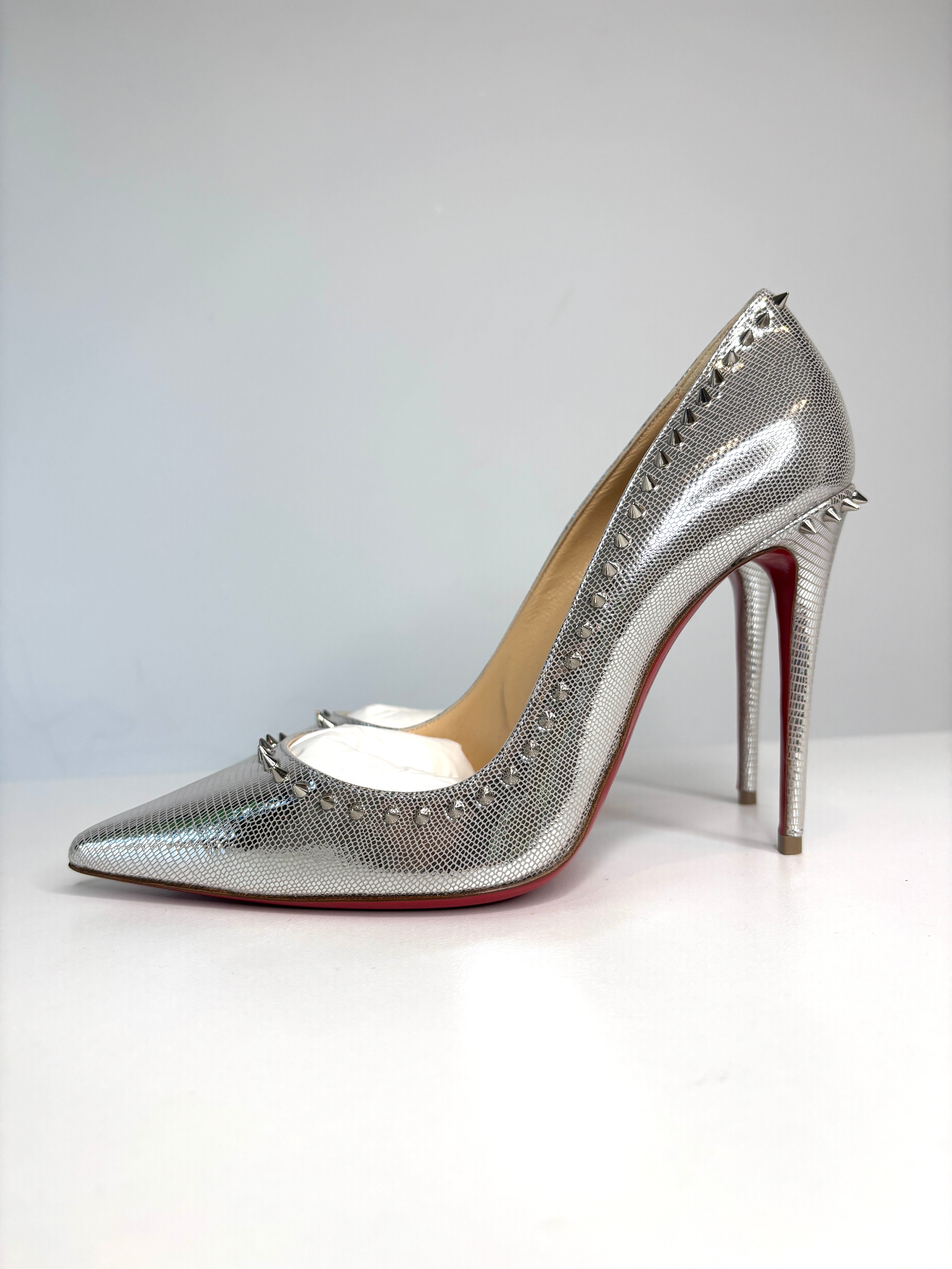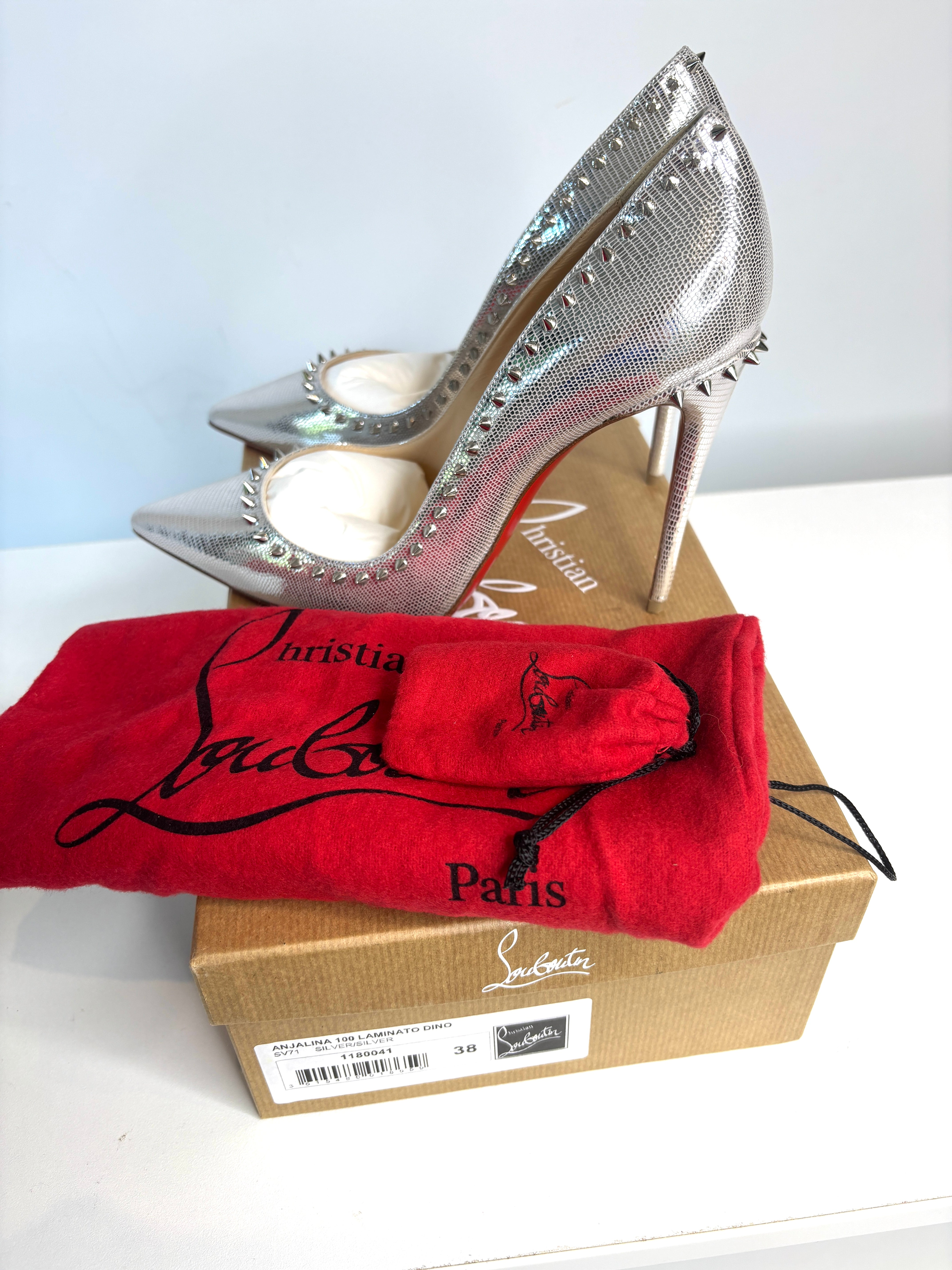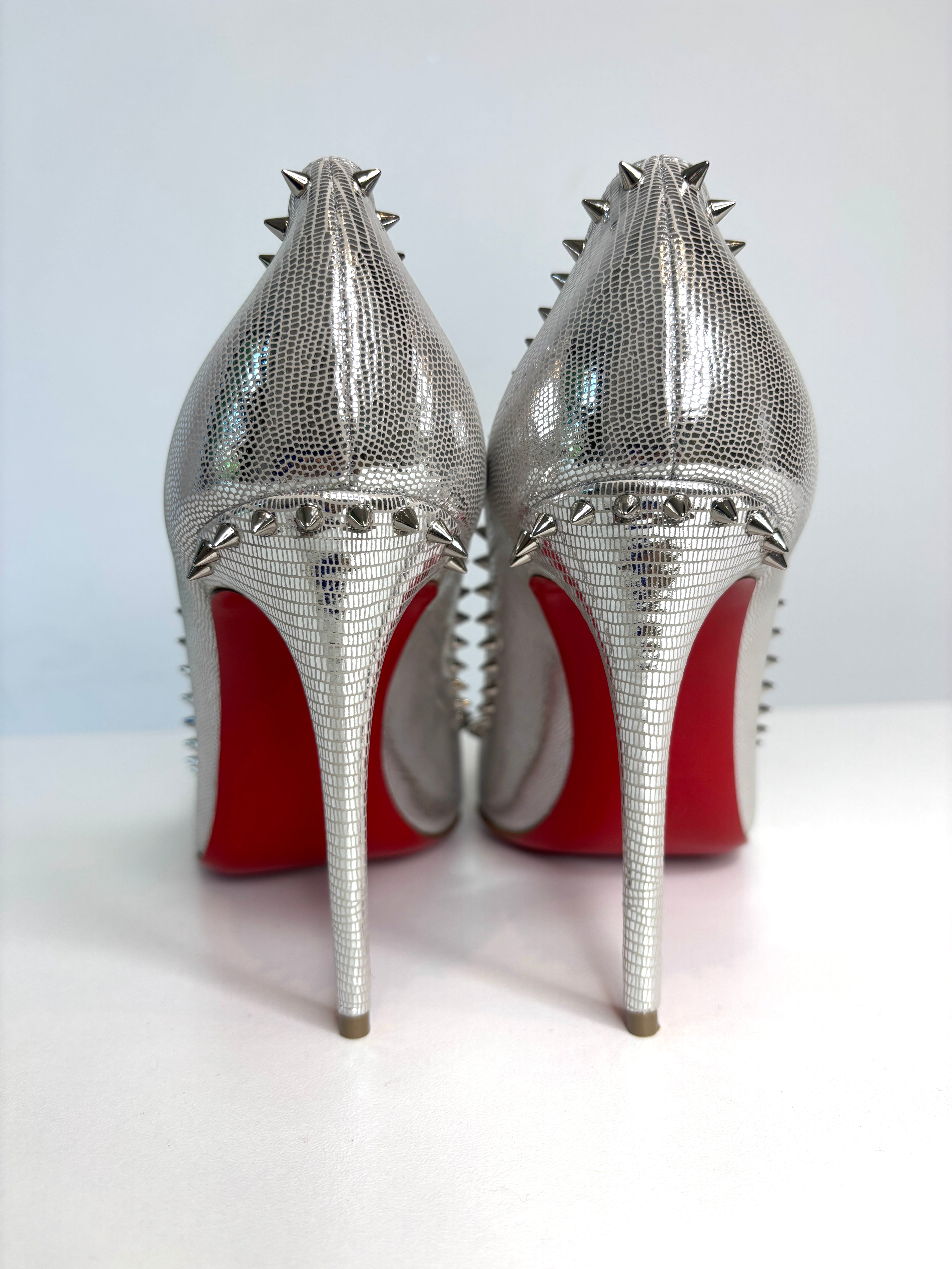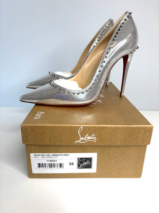 Christian Louboutin Anjalina 100 Metallic Silver Spike Heels 38 UK5