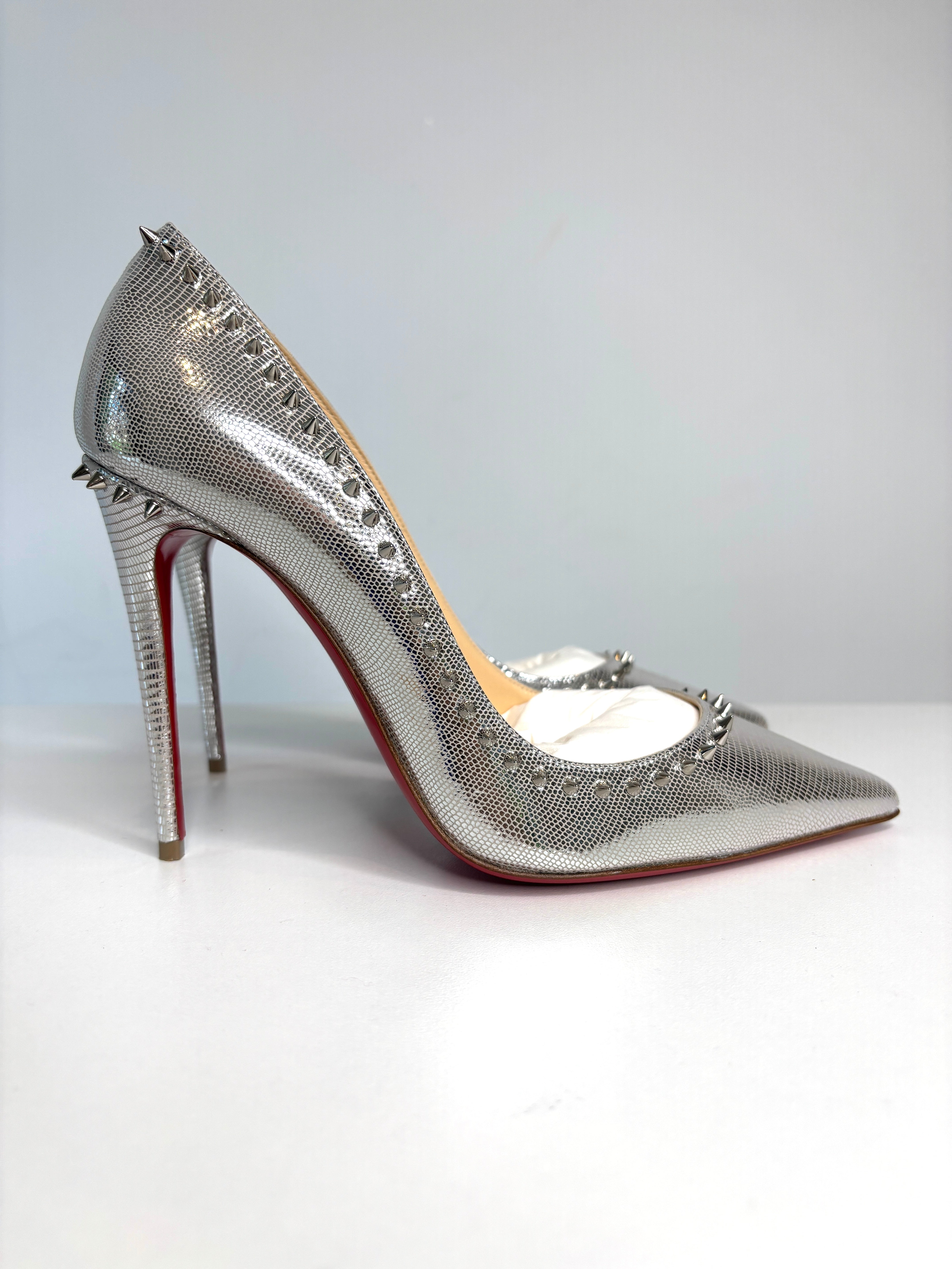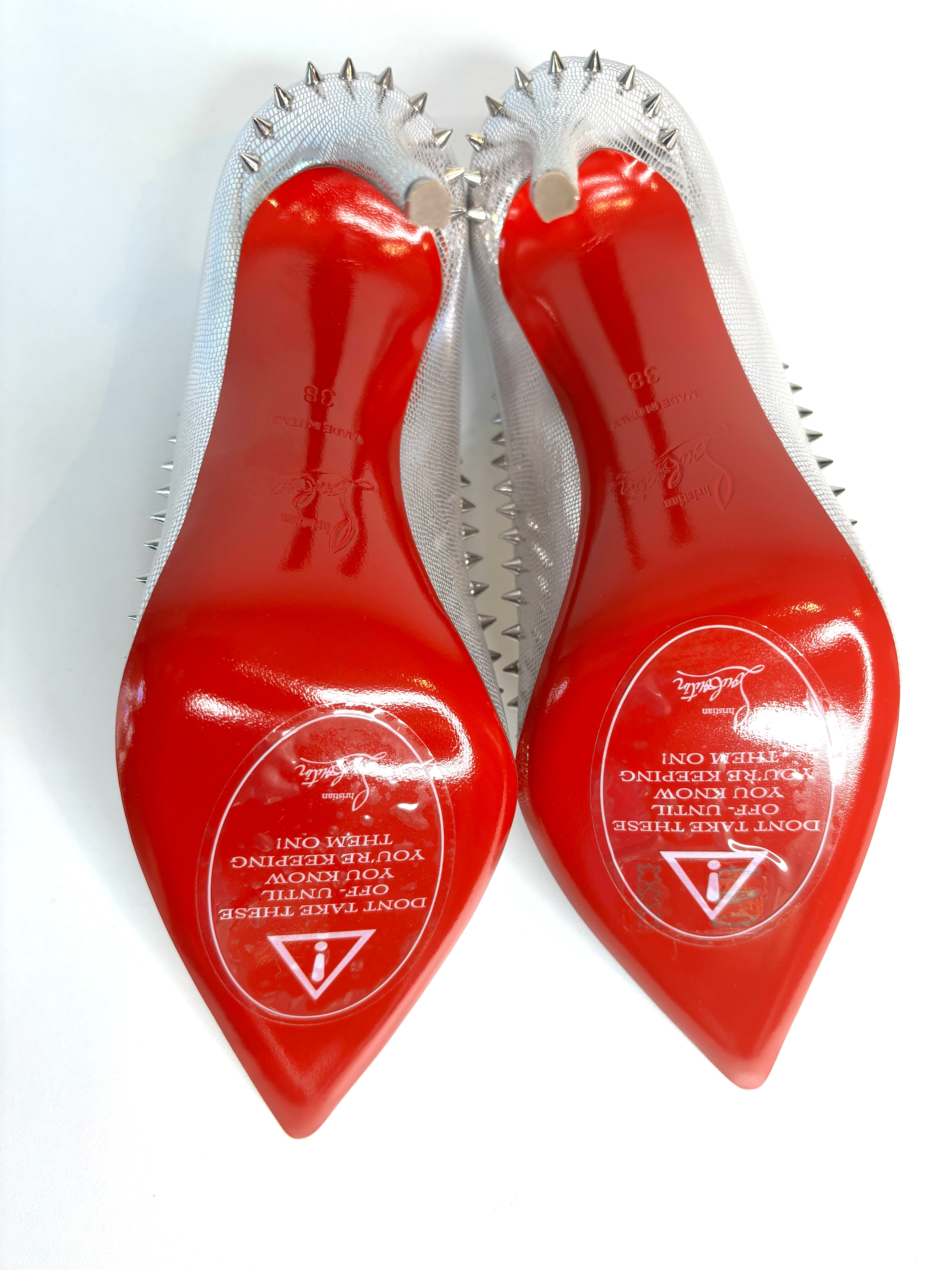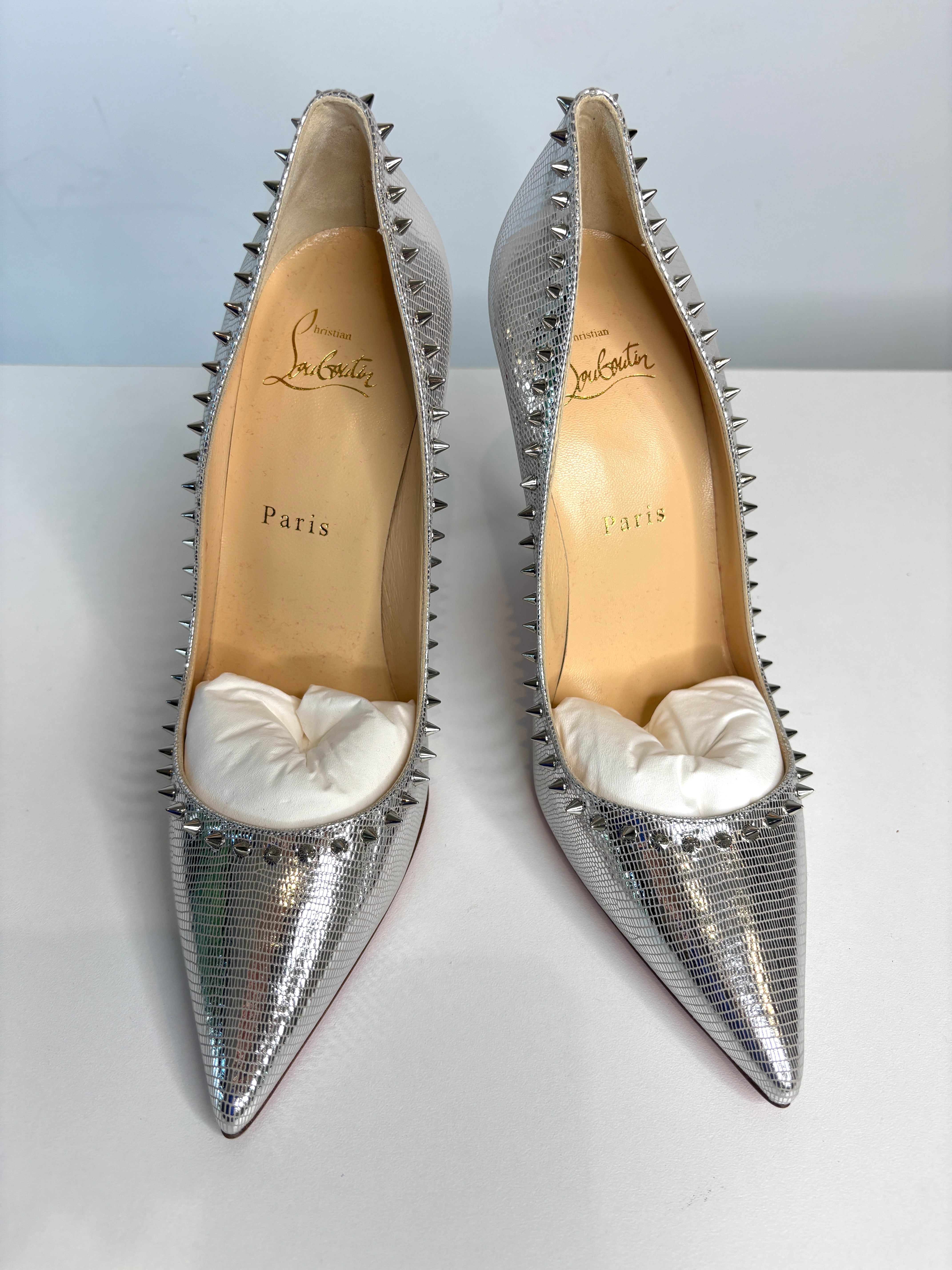 Christian Louboutin Anjalina 100 Metallic Silver Spike Heels 38 UK5