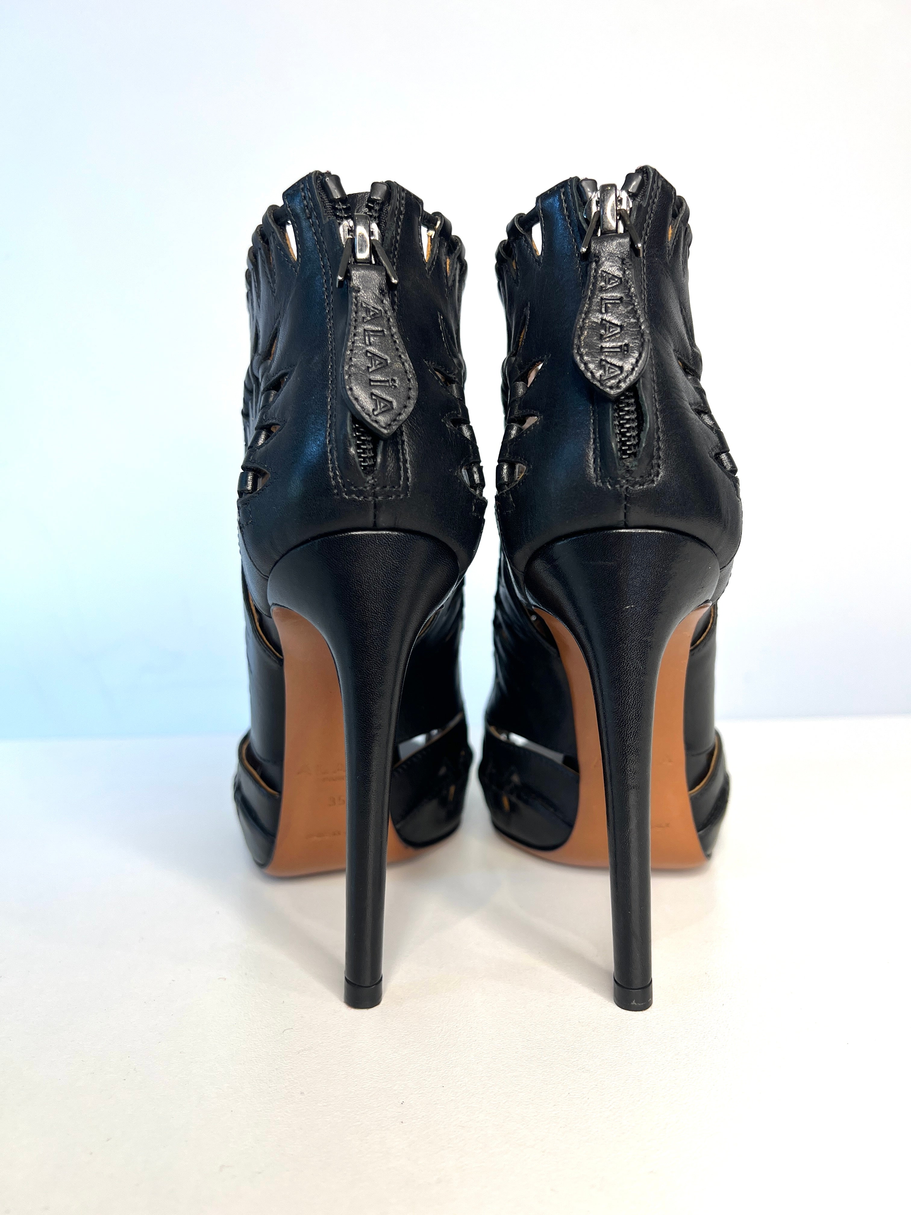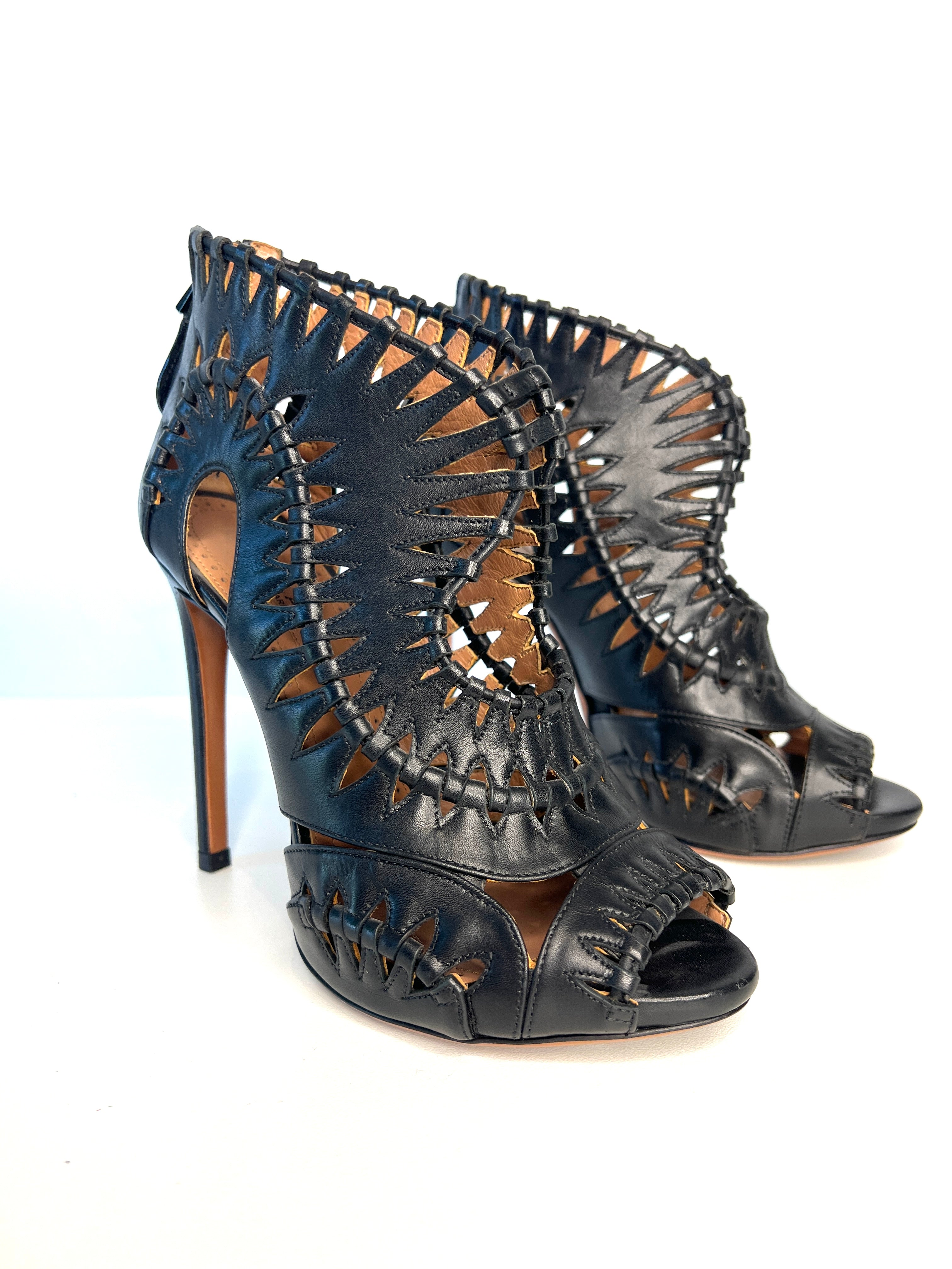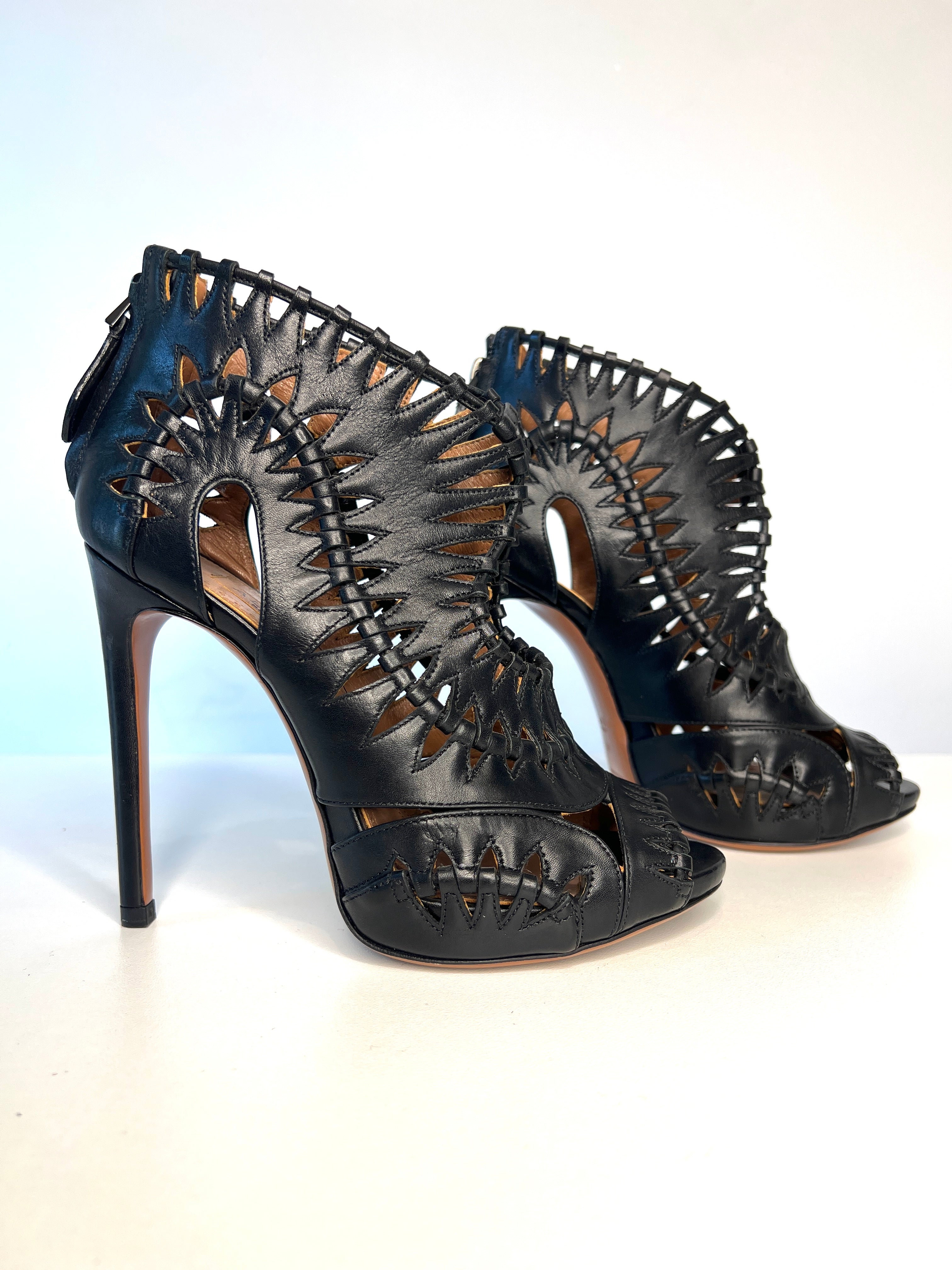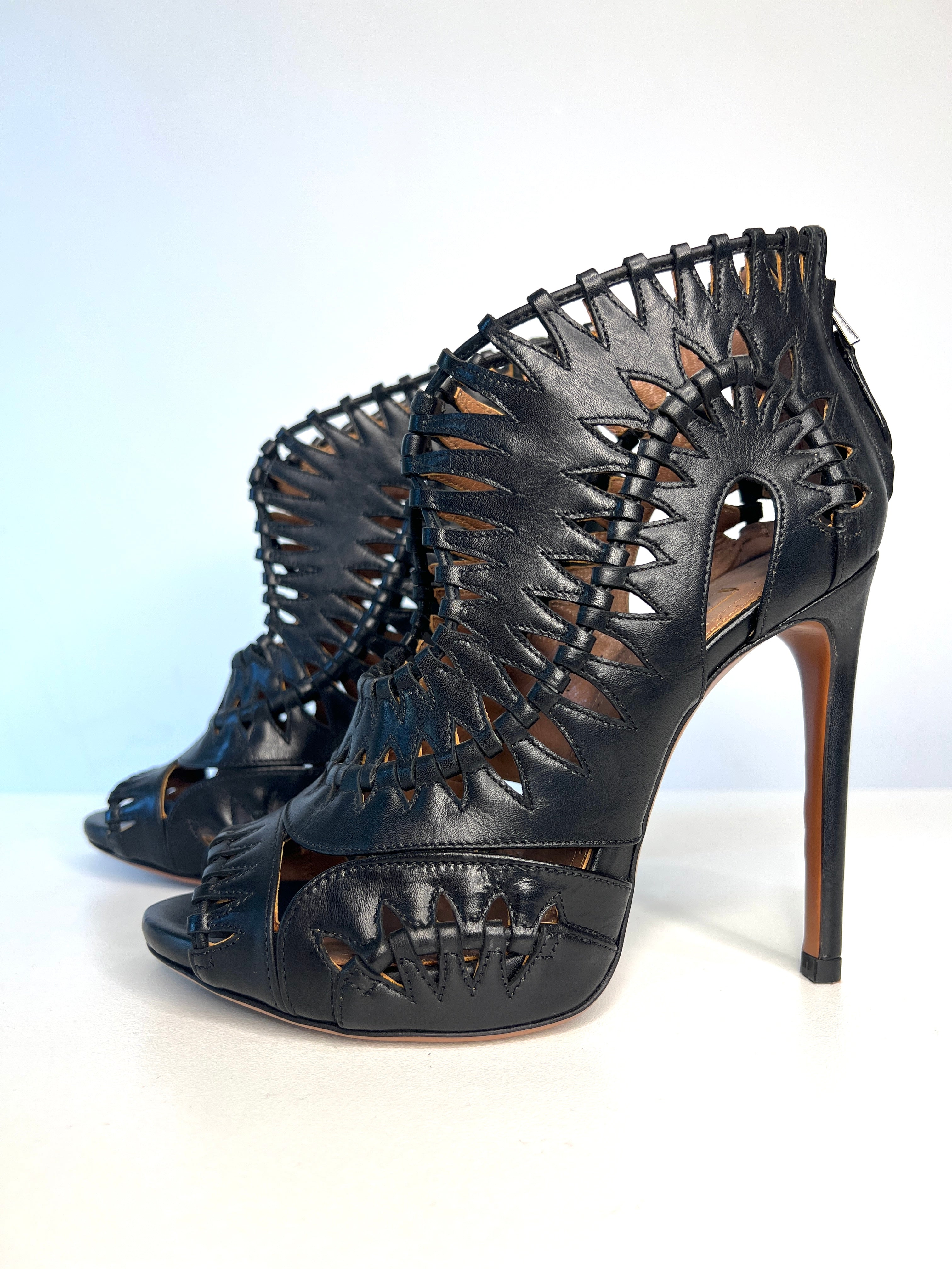 Alaia Black Leather Laser-Cut Peep-Toe Heels 35 UK2