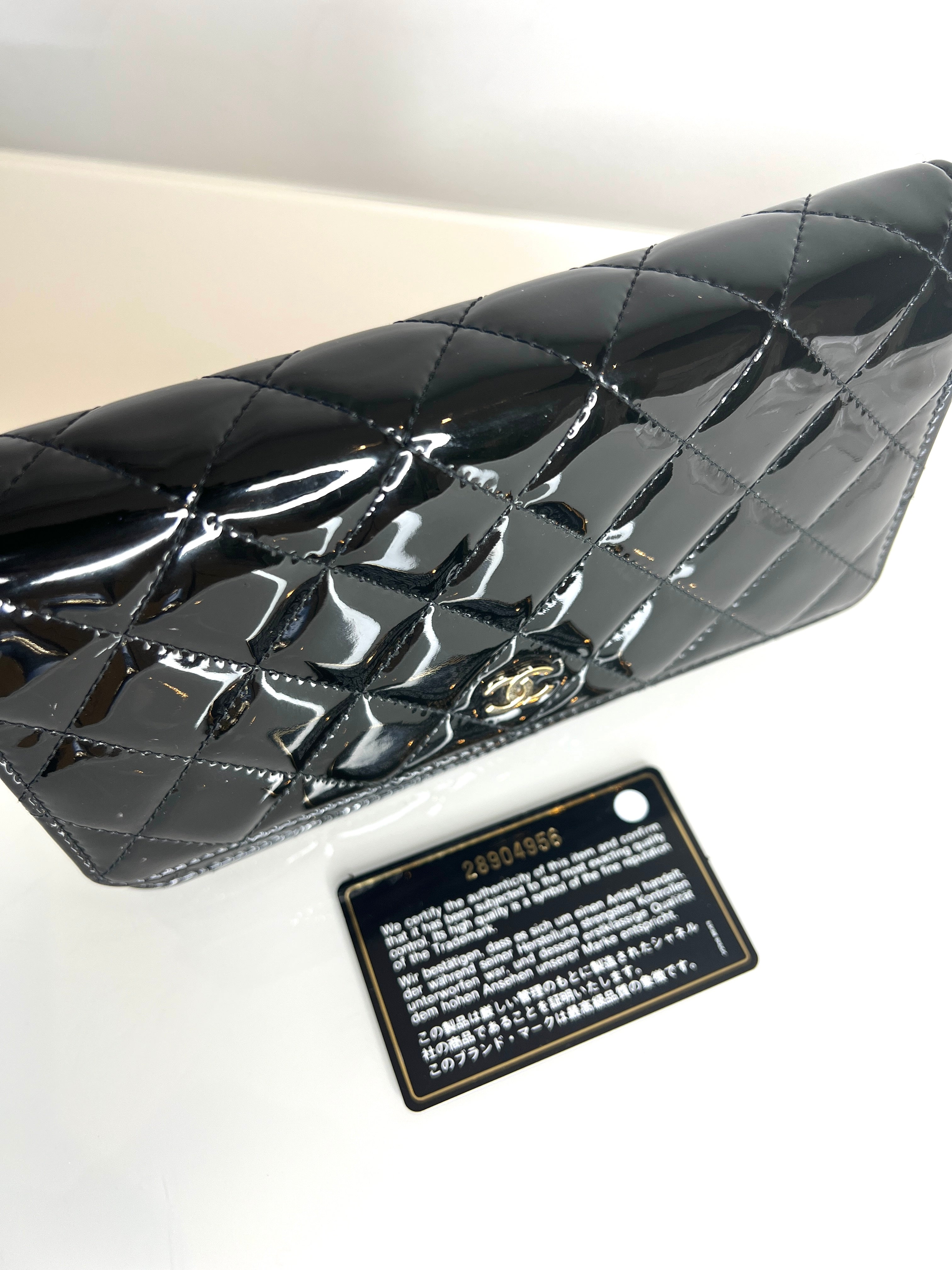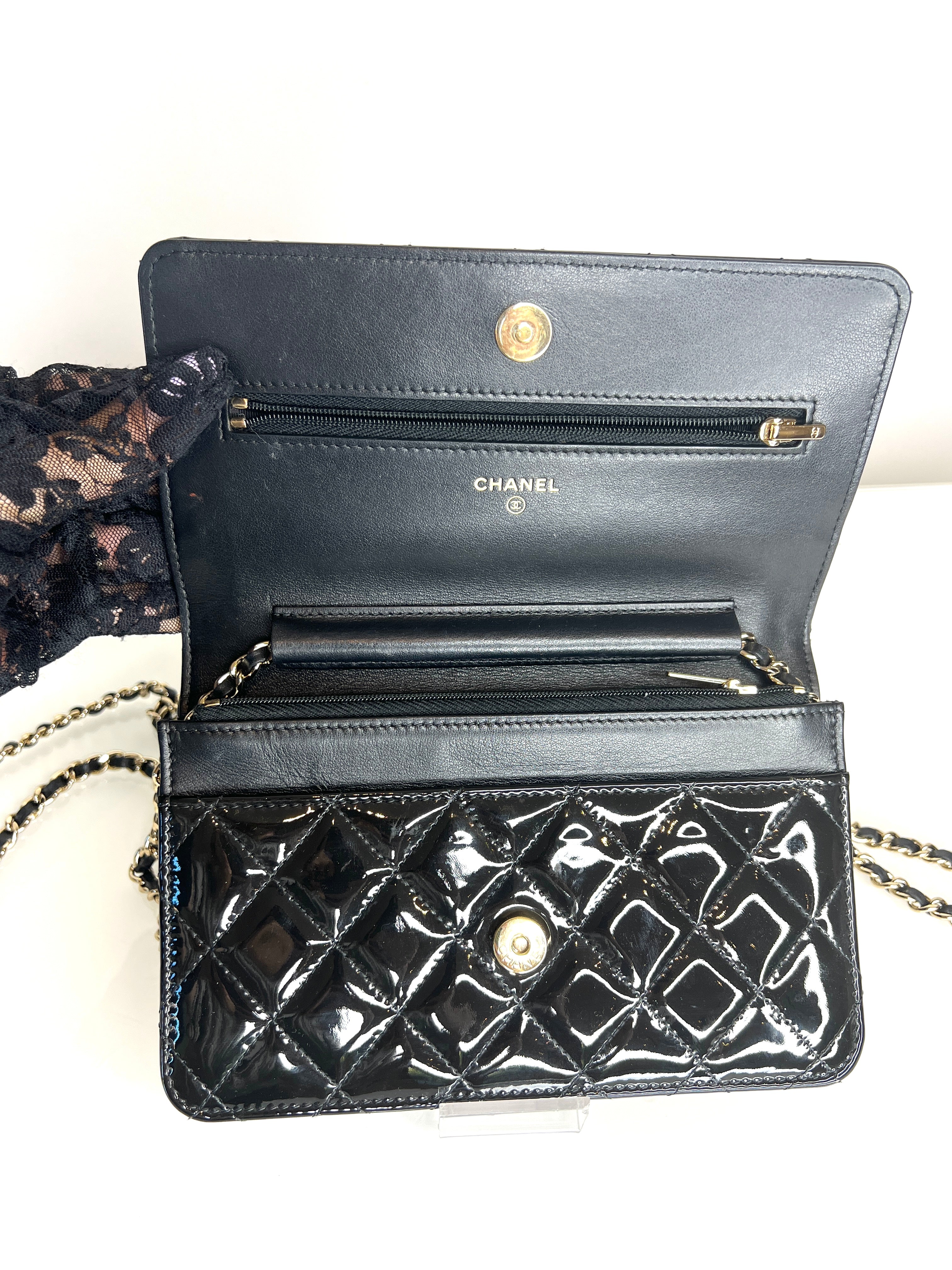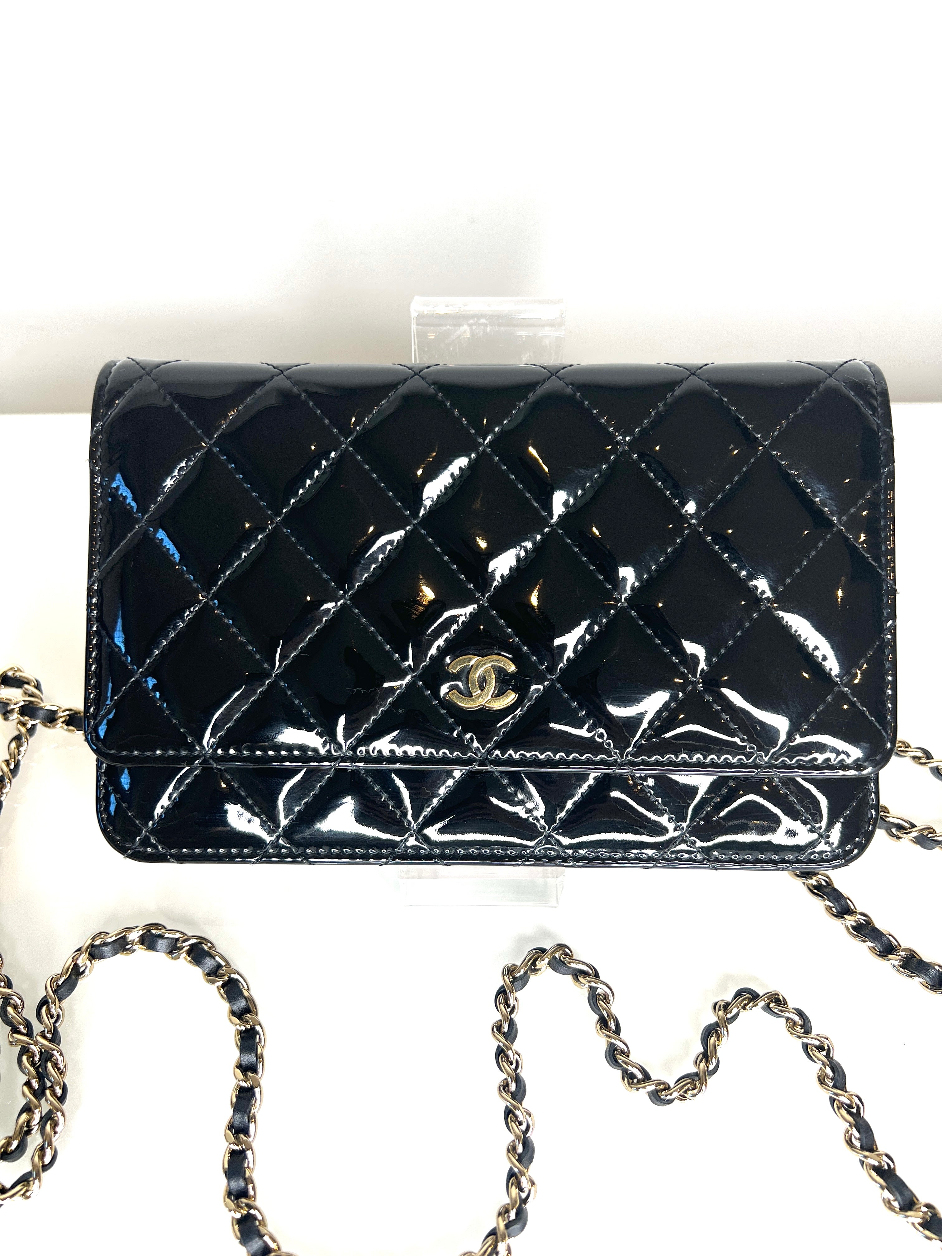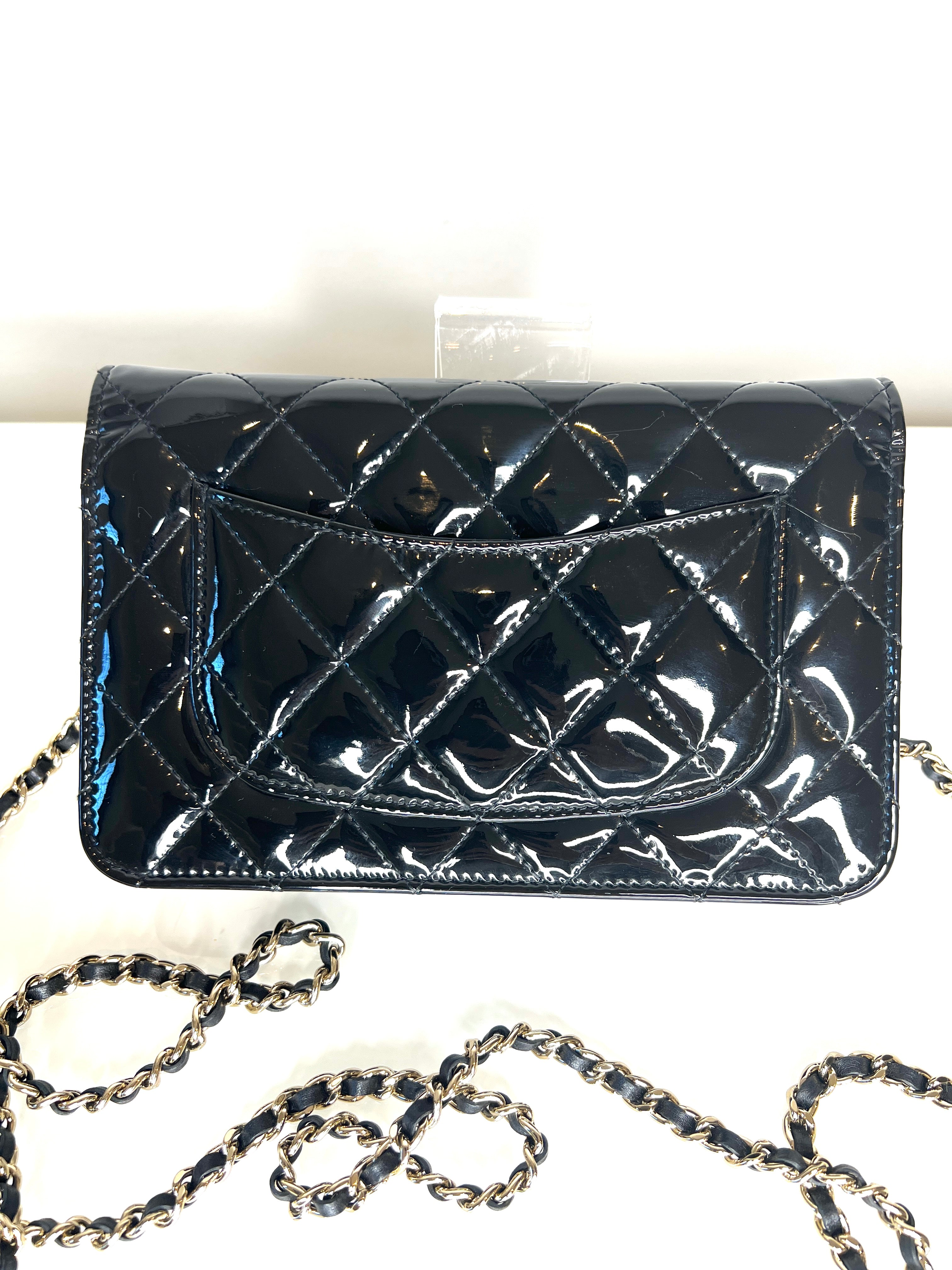 This iconic Chanel Wallet On Chain is specifically crafted in glossy black patent leather with a diamond-quilted finish, that provides a modern, sophisticated look