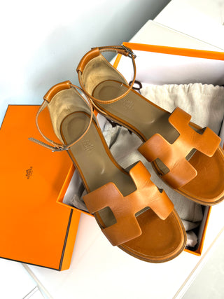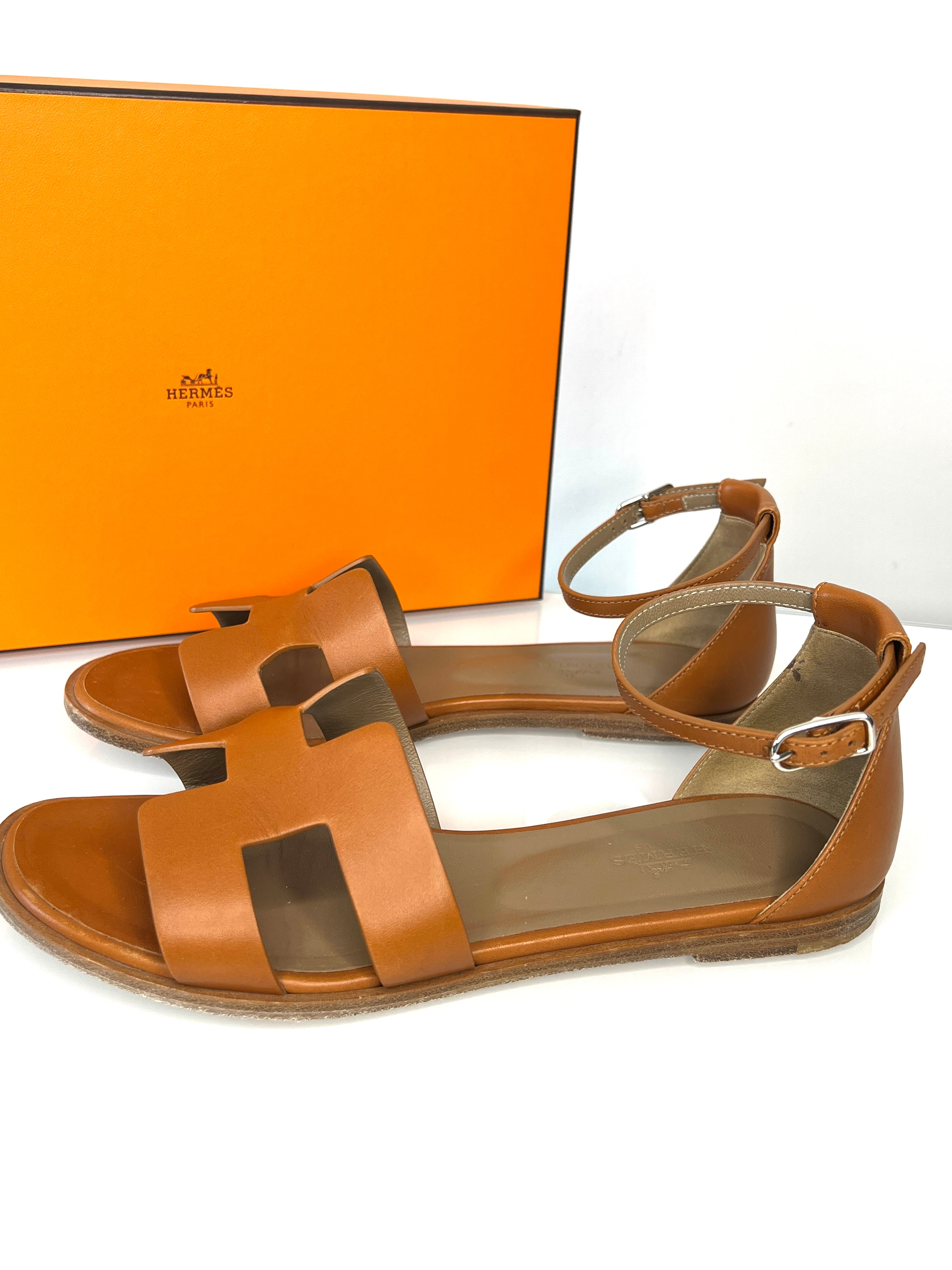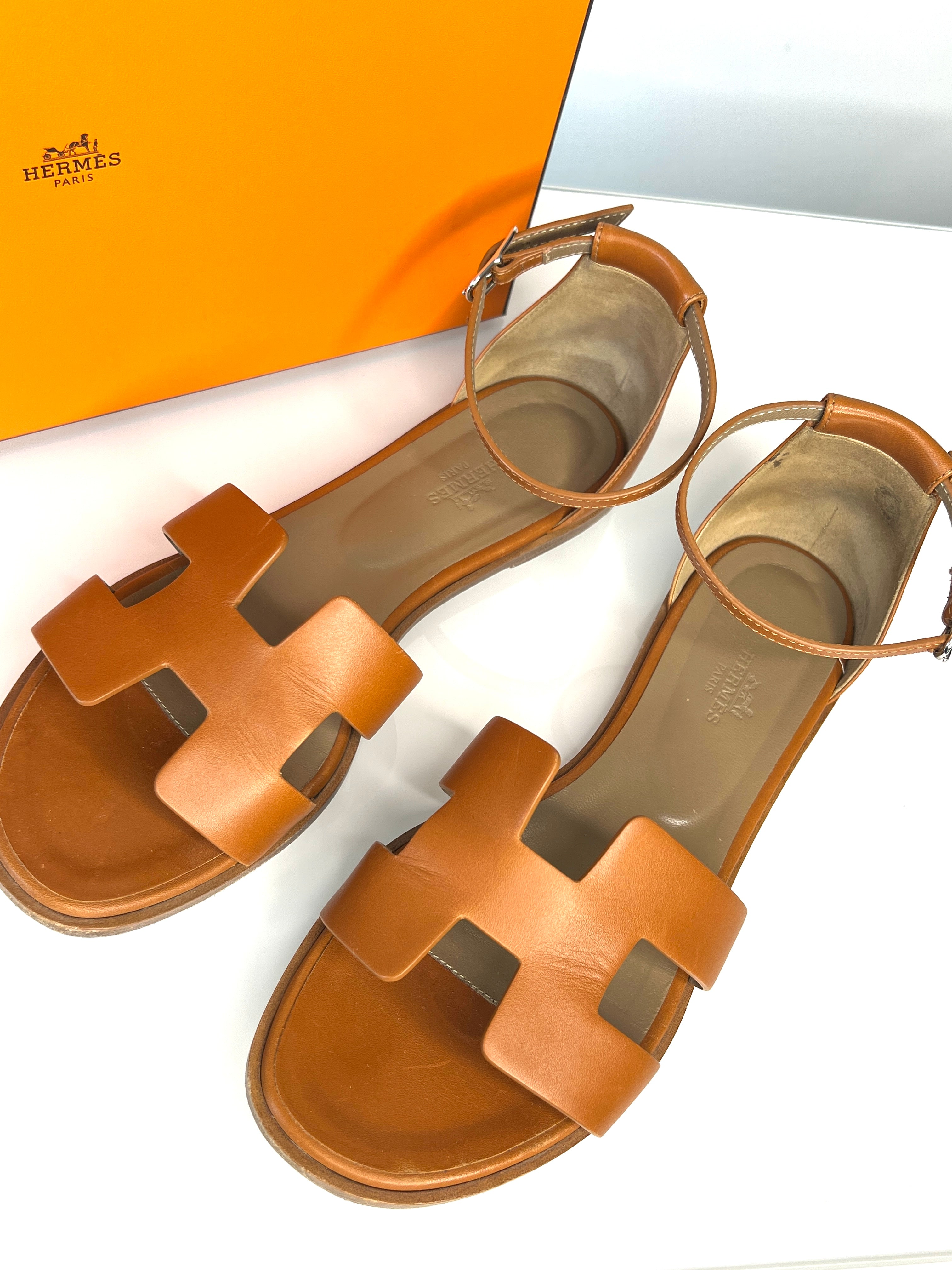 Hermes Santorini Brown Leather Flat Sandals 38 UK5 - Preloved