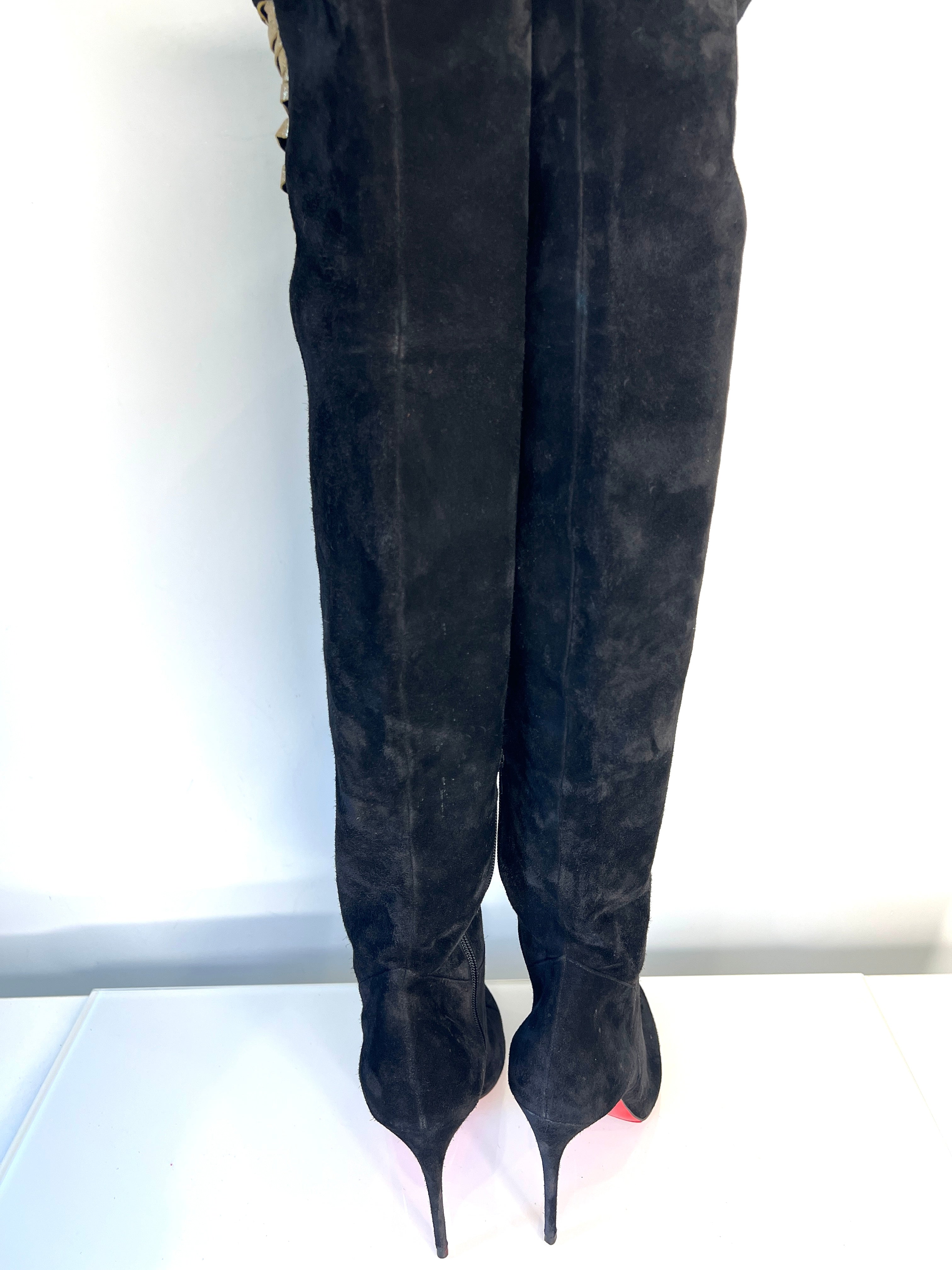 These Christian Louboutin Siegfridalta boots are crafted from luxurious black suede and feature a distinctive metallic gold strappy or ‘fringe’ detail along the shaft