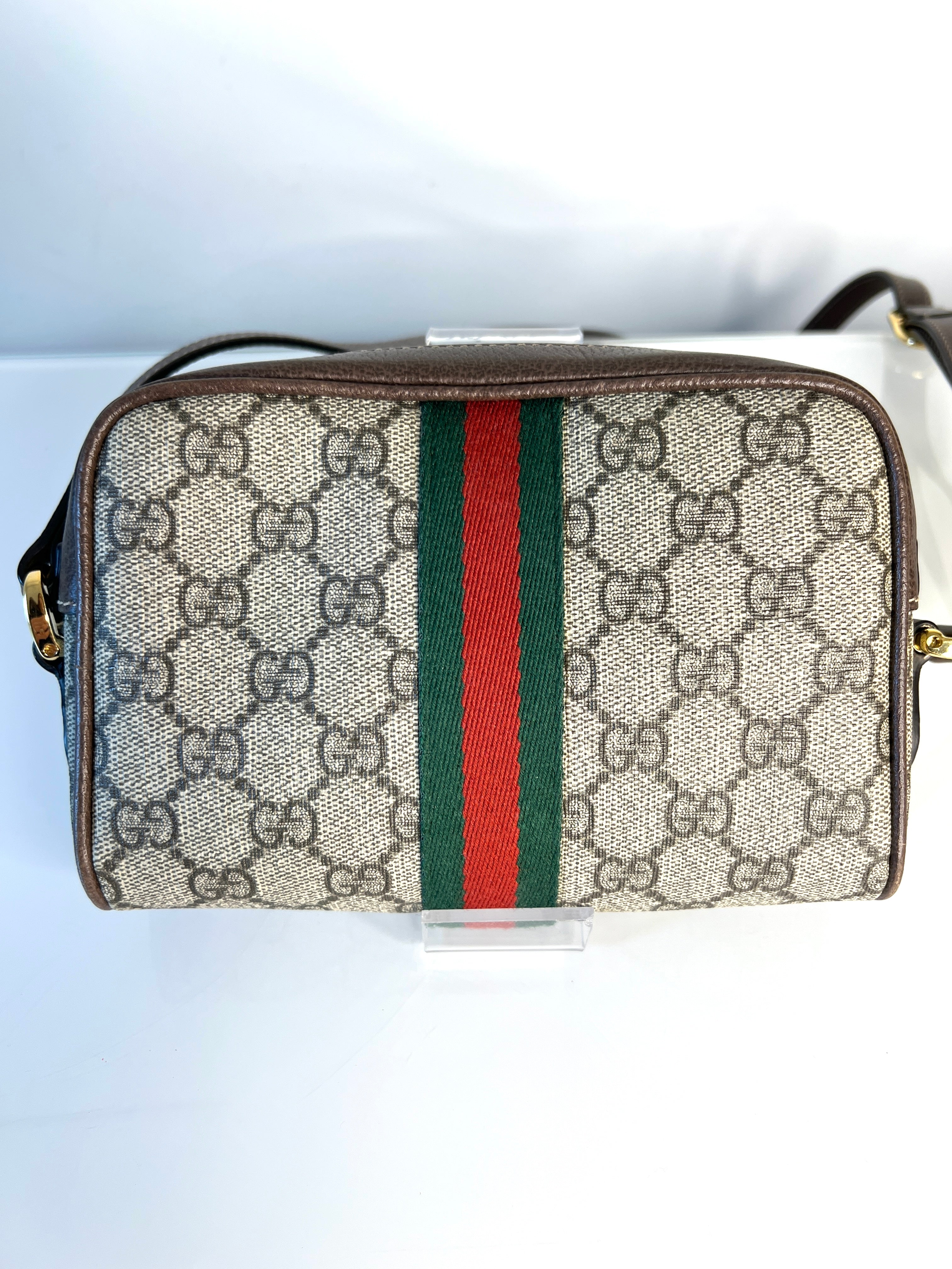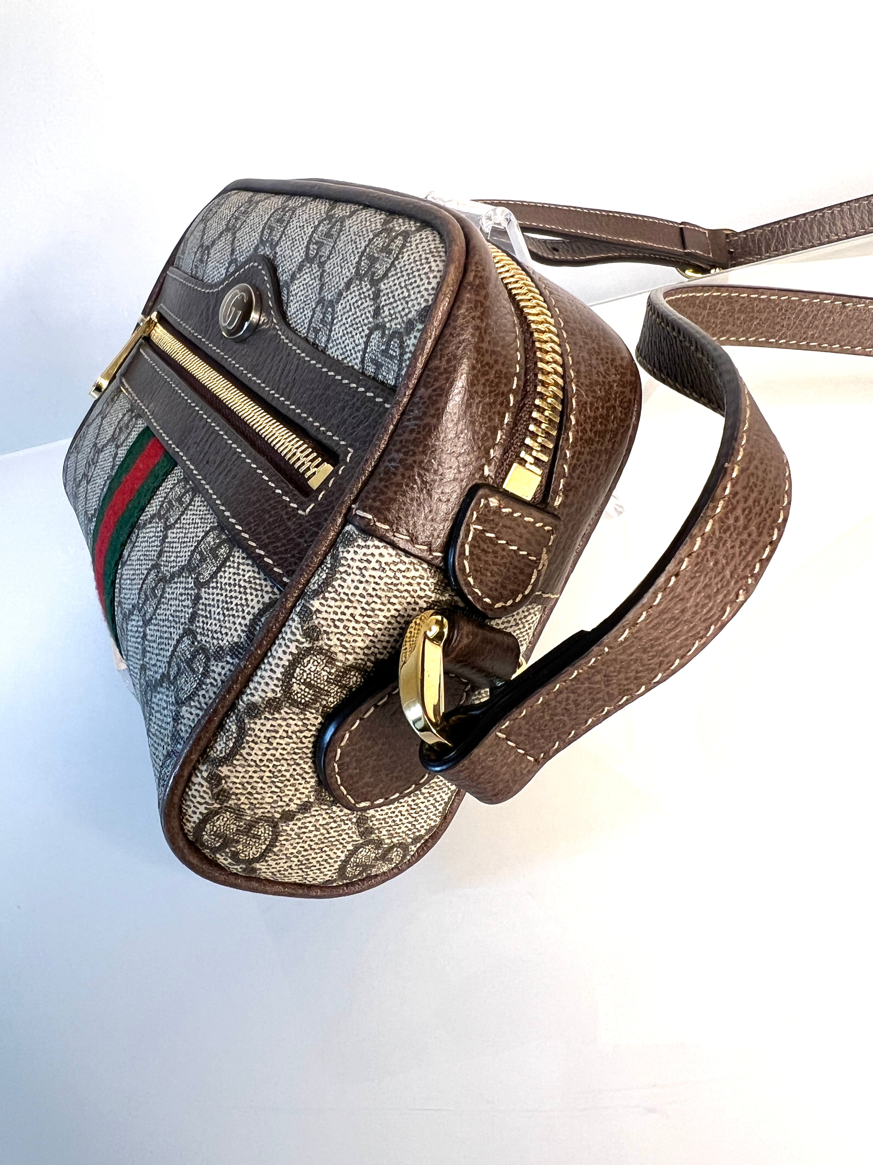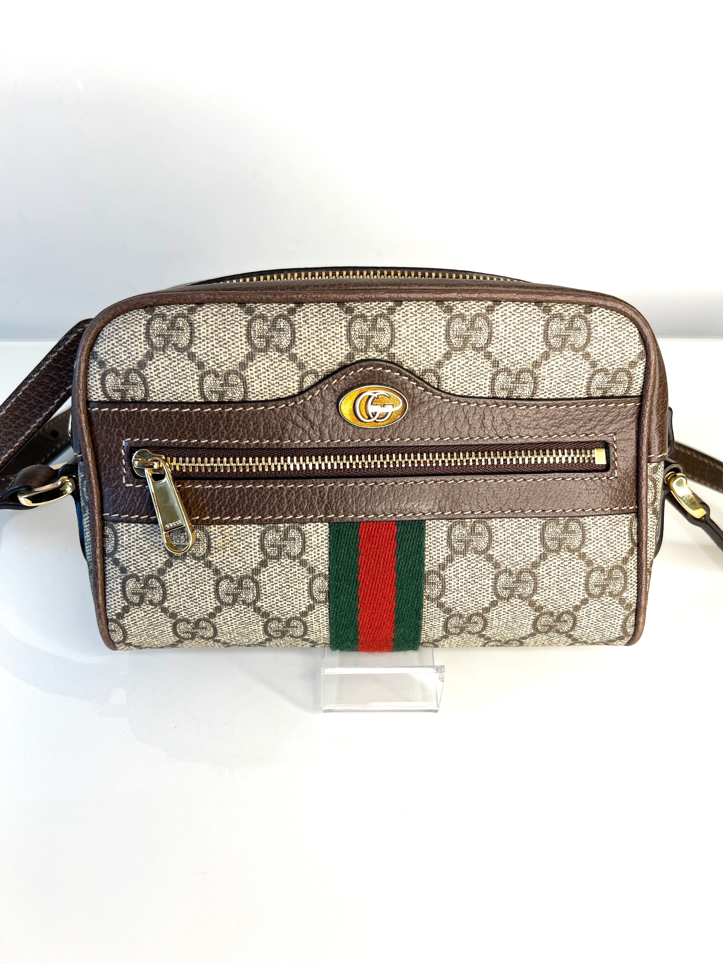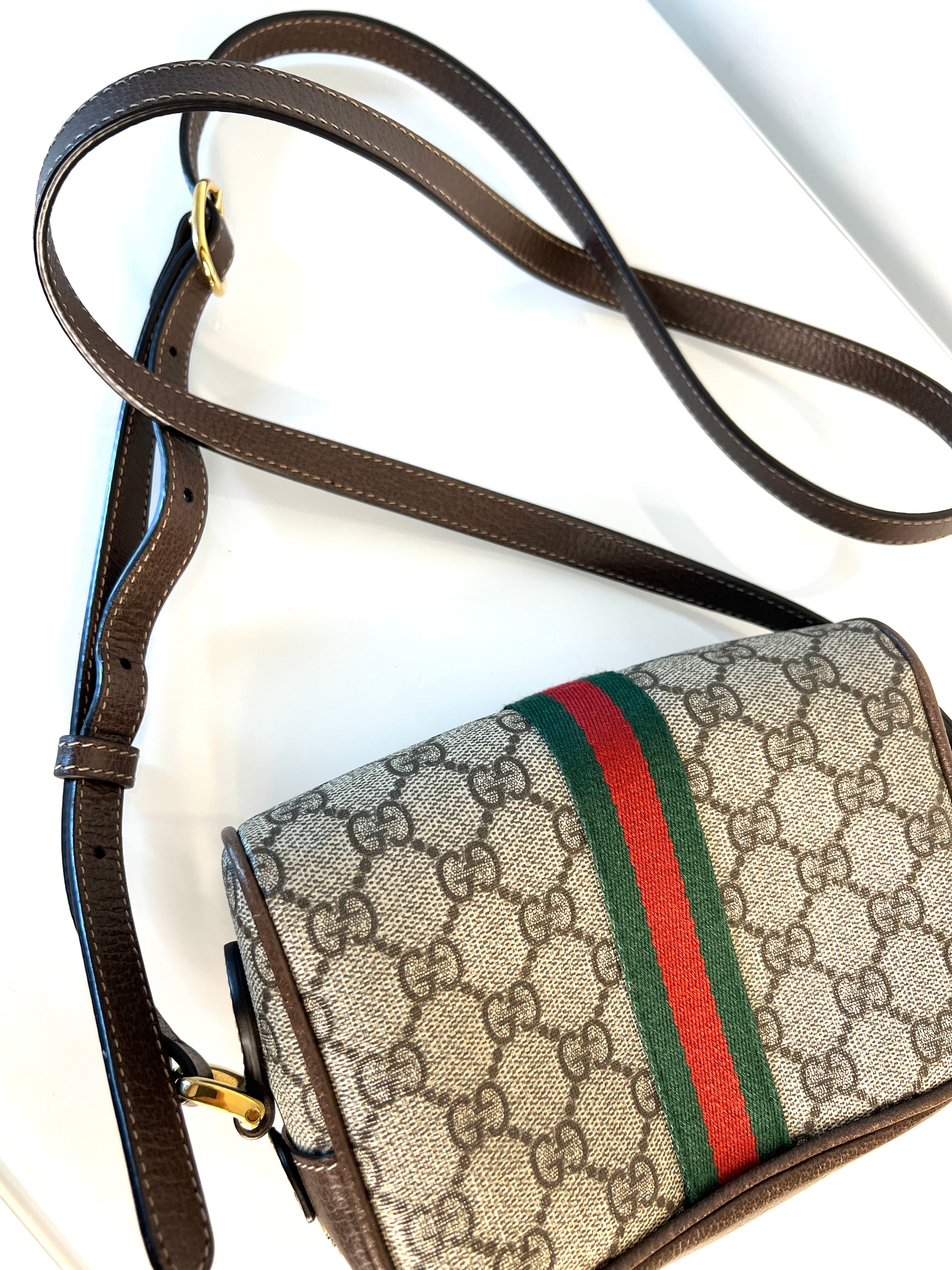 This Gucci Ophidia Mini shoulder bag features the GG Supreme canvas in beige and ebony, the signature green and red Web stripe and gold-tone Double G hardware